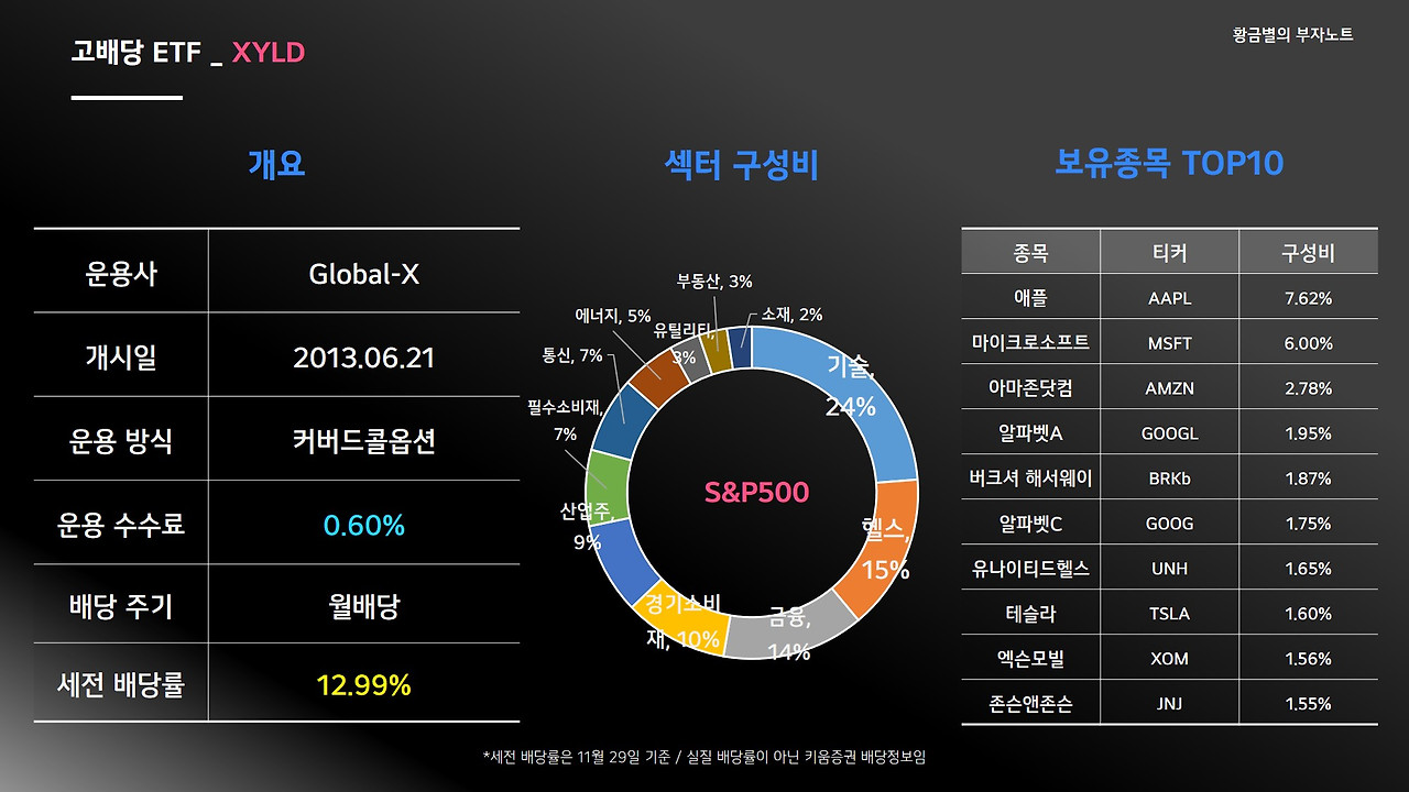 XYLD는 글로벌-X 자산운용사에서 2013년 6월에 출시한 S&P500 지수를 기반으로 커버드콜-옵션 전략을 실행하는 ETF입니다. 추종하는 지수만 나스닥100으로 다를뿐 비슷한 운용전략을 가진 QYLD보다 6개월 빨리 상장된 ETF입니다. 액티브 펀드라 운용 보수가 0.6%로 높은 편이며, 월배당 종목으로 세전 배당률은 12.99%로 13%에 육박하는 높은 배당률을 나타내고 있습니다.