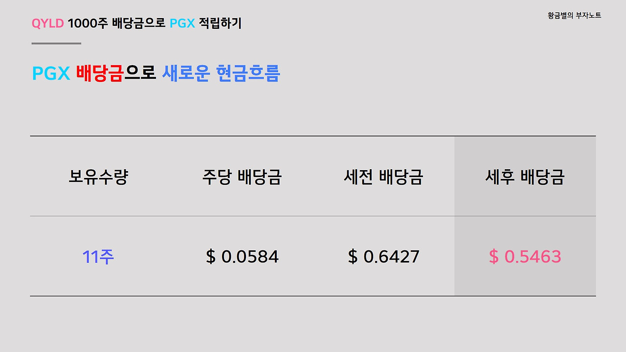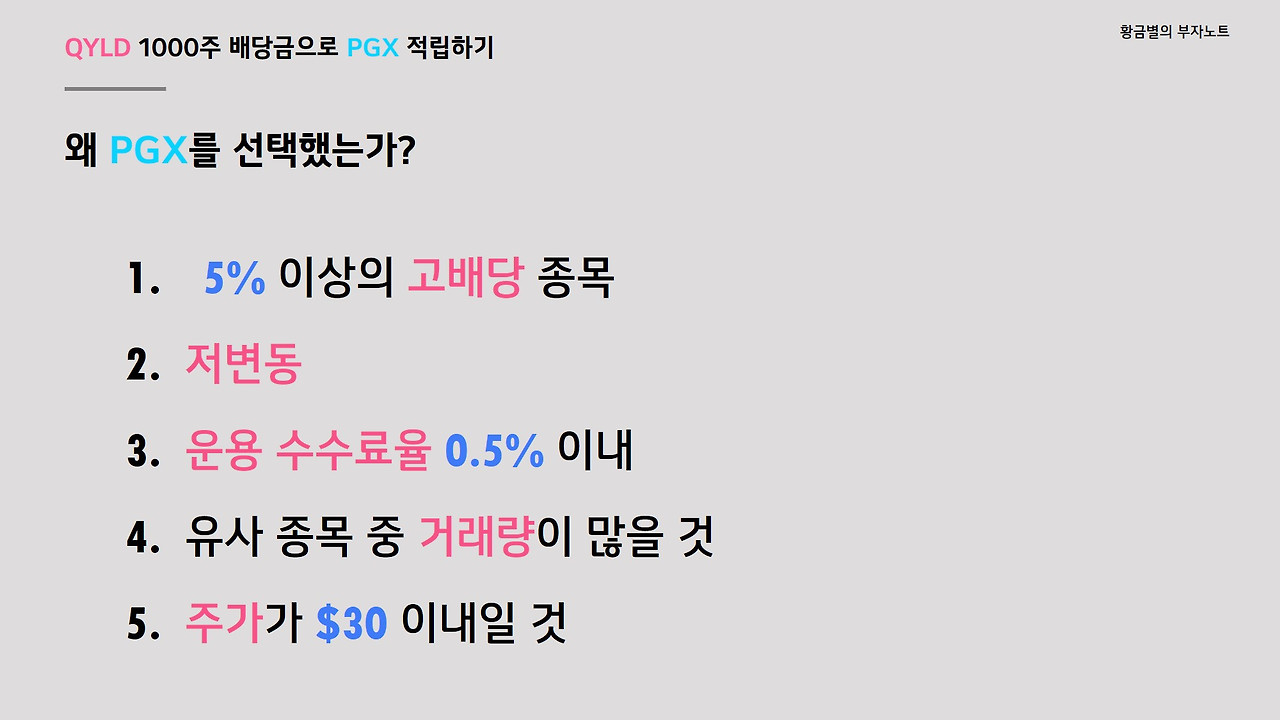 그리고 운용 보수도 너무 높지 않고 0.5% 이내여야 장기적으로 모아가기 좋을 것 같고, 유사종목 중 거래량이 많아서 쉽게 매도할 수 있는 종목으로 선택하고자 했습니다. 마지막 조건은 주가가 30달러 이내인 종목으로 선택하고자 했습니다. QYLD 1000주의 배당금은 세후 150달러 이내이기 때문에 비싼 종목들의 경우는 몇달 치 배당금을 모아야 1주 살 수 있고, 수량을 늘려가는 재미를 느끼기 힘들기 때문입니다. 배당금 재투자의 경우는 수량을 늘려가는 재미가 있어야 확실한 동기부여가 되는 것 같더라구요. 그래서 저는 배당금으로 재투자할 때 QYLD나 SPYG, 그리고 이번에 PGX까지 주가가 낮은 종목들을 선택하는 스타일입니다.