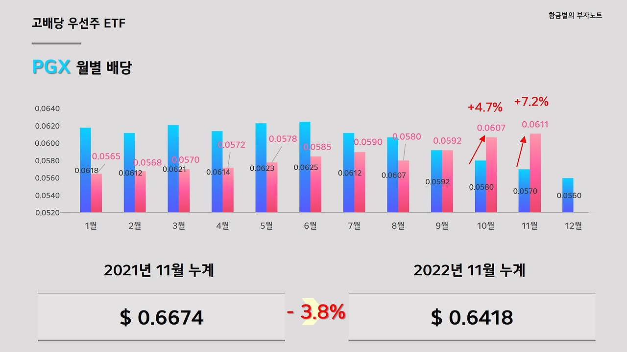 PGX의 11월 배당금은 0.0611달러로 전년 동월대비해서 +7.2% 증가했습니다. 하지만 올해 11월까지 누적 배당금은 주당 0.6418달러로 전년 동기간과 비교했을 시는 -3.8% 감소되었는대요. 올해 1월부터 8월까지 월별 배당금이 전년 동월대비해서 -4%에서 -8%까지 큰폭으로 감소추세를 나타내서 우려스러웠는대, 9월 이후로는 배당금이 전년수준을 유지하거나 전년 동월대비해서 증가하는 추세를 나타내고 있습니다. 12월 배당금도 기대해보면 좋겠네요.