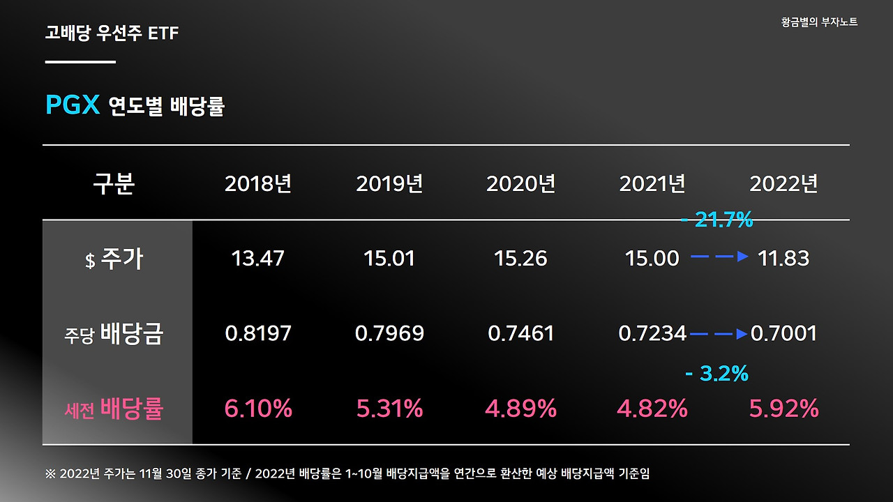 PGX의 최근 5개년 주가 흐름을 보면 2018년 13달러에서 15달러선까지 갔다가 올해 들어 11달러 후반대로 폭락했습니다. 작년 대비해서는 주가가 -21.7%나 하락했고, 주당 배당금도 -3.2%정도 감소할 것으로 전망됩니다. 역시나 주가 하락으로 인해 세전 배당률이 5.92%로 6% 가까이 치솟은 상태입니다.