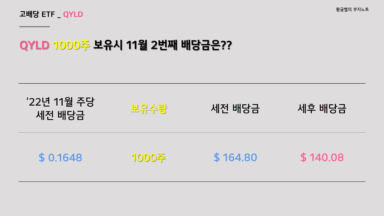 QYLD의 이번 배당금은 주당 0.1648달러이며, 1000주 보유시 세전 164.8달러, 세후로는 140.08달러를 수령받게 됩니다.