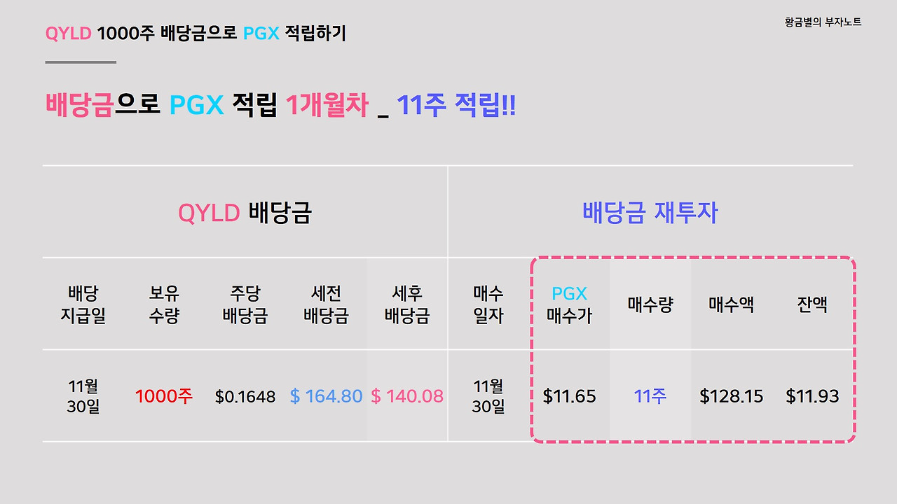 이렇게 QYLD 1000주의 11월 배당금으로 고배당 우선주ETF인 PGX 11주를 매수했습니다. 그리고 이 PGX 11주는 올해 마지막날인 12월 31일에 저에게 0.55달러라는 채 1달러도 되지 않는 작지만 소중한 배당금을 지급할 것입니다. 이렇게 매월 조금이지만 천천히 현금흐름은 늘어나고 있습니다. PGX는 1주당 가격이 낮아 배당률이 6% 가깝더라도 적은 수량으로는 배당금에 대한 만족을 느끼기는 어렵습니다. 최소한 1000주 이상은 되야 월 5~6만 원이라는 배당금을 받을 수 있으니까요. 하지만 수량을 늘려가는데 있어 동기부여는 충분히 가능한 종목입니다. 이렇게 작은 것에서부터 만족을 느끼며 끈기있게 지속적으로 해나가면 여러분의 자산과 현금흐름은 스노우볼처럼 커져갈 것입니다.