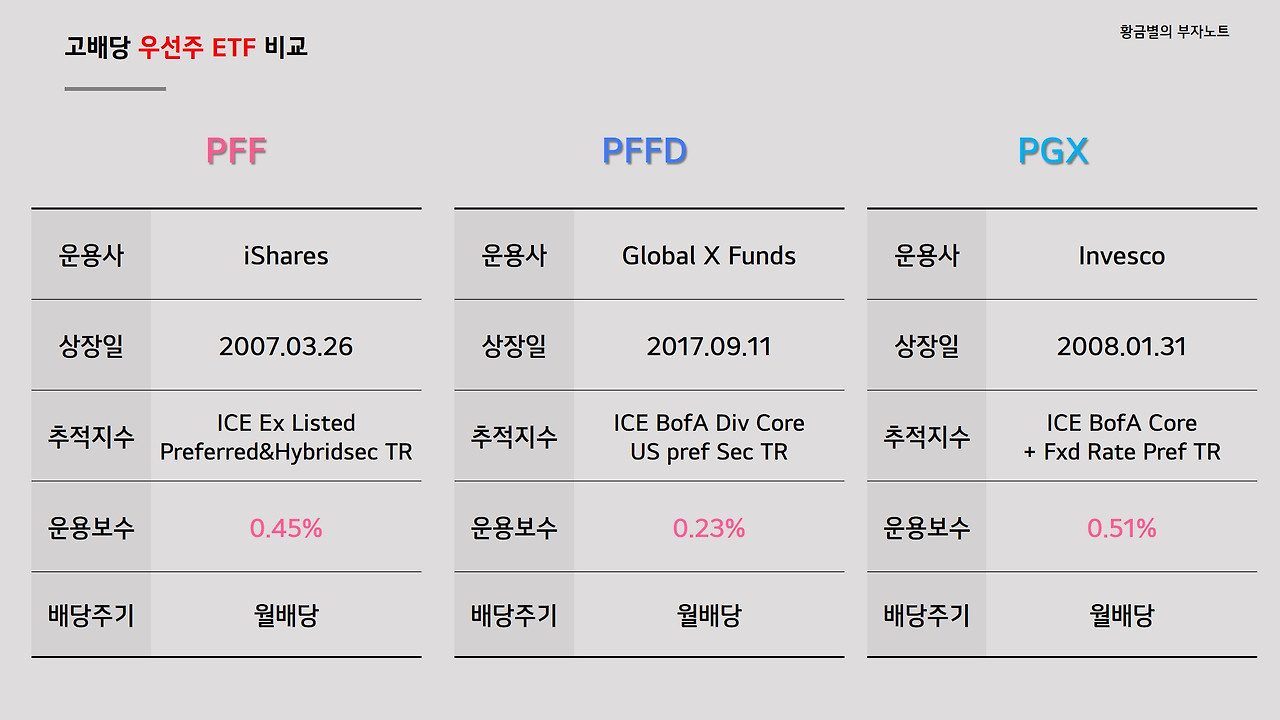 PGX는 고배당 우선주ETF로 제가 전에 영상으로 소개드린 적이 있는 종목입니다. 해당 영상에서 우선주 ETF 3종목 특징 먼저 간략히 소개드리고 각각의 주가와 배당정보를 비교해드렸었는대요, PFF는 세계 최대 자산운용사인 블랙락 아이쉐어즈에서 2007년에 출시한 ETF입니다. 운용보수는 0.45%이며 월배당입니다. PFFD는 미래에셋에서 운용한 글로벌 X 펀드에서 2018년 9월에 출시해서 3개 ETF 중에는 가장 최근에 출시되었습니다. 글로벌 X 펀드는 커버드콜 고배당 ETF인 QYLD와 XYLD를 운용하고 있는 운용사로 유명합니다. 운용보수는 상대적으로 저렴한 0.23%이며 월배당을 지급합니다. PGX는 세계 4대 자산운용사인 인베스코에서 2008년에 출시했고, 운용보수가 0.51%로 3종목 중에서는 가장 비싸네요. 마찬가지로 매월 배당을 지급하는 월배당 ETF입니다. 3개 ETF 모두 규모있는 대형 자산운용사에서 출시한 ETF라 우선 그 점에서는 믿음이 갑니다.