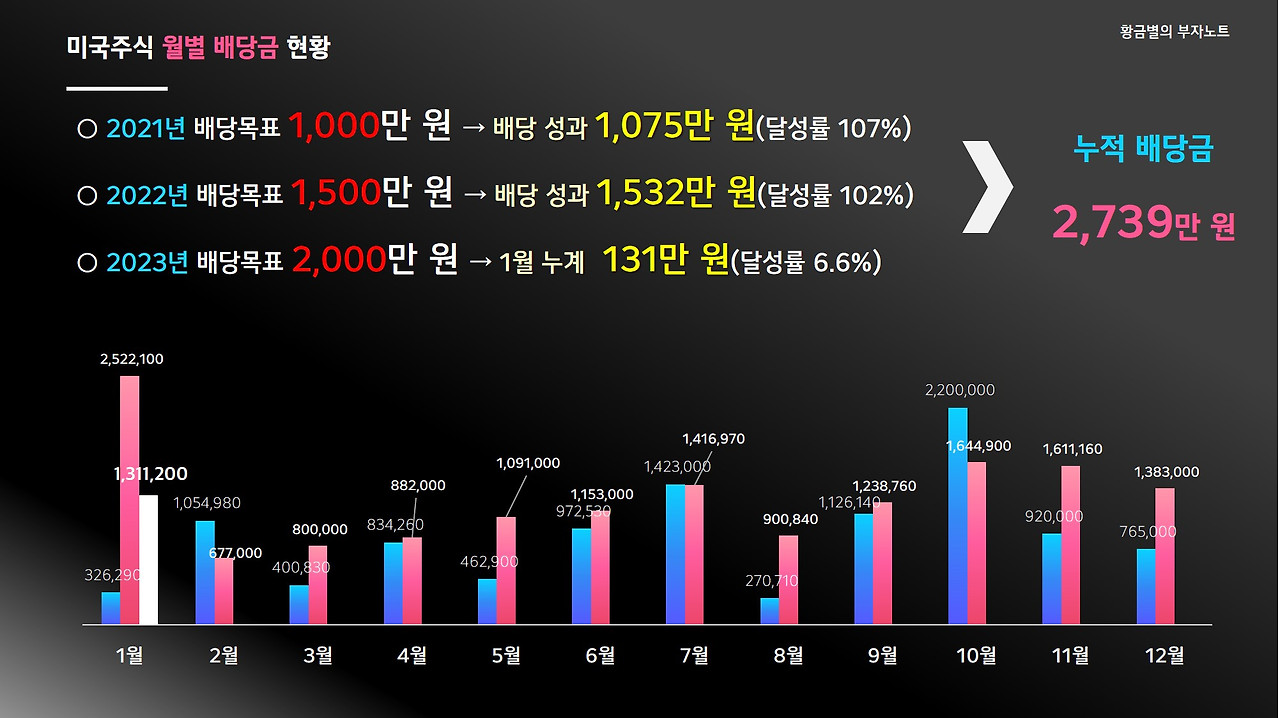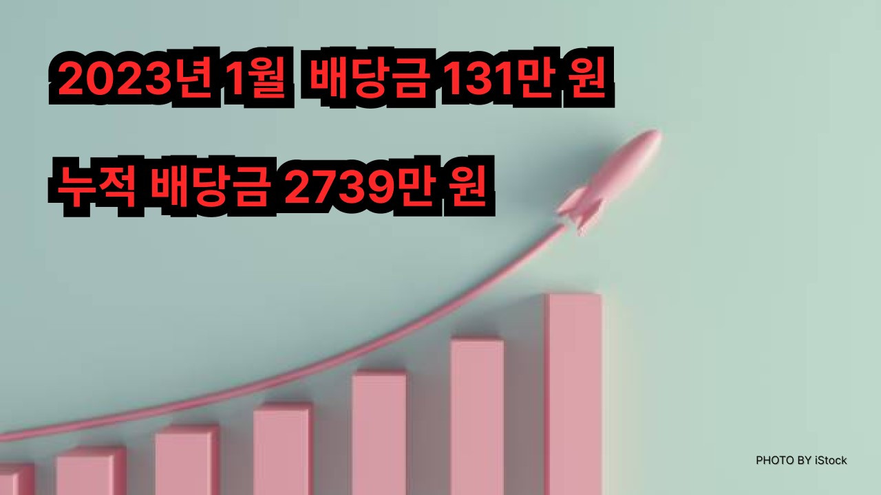 2023년 1월 새해 첫 달에 받게 될 배당금은 131만 원이고, 미국 배당주 투자를 시작한 이후 누적 배당금은 2739만 원입니다.