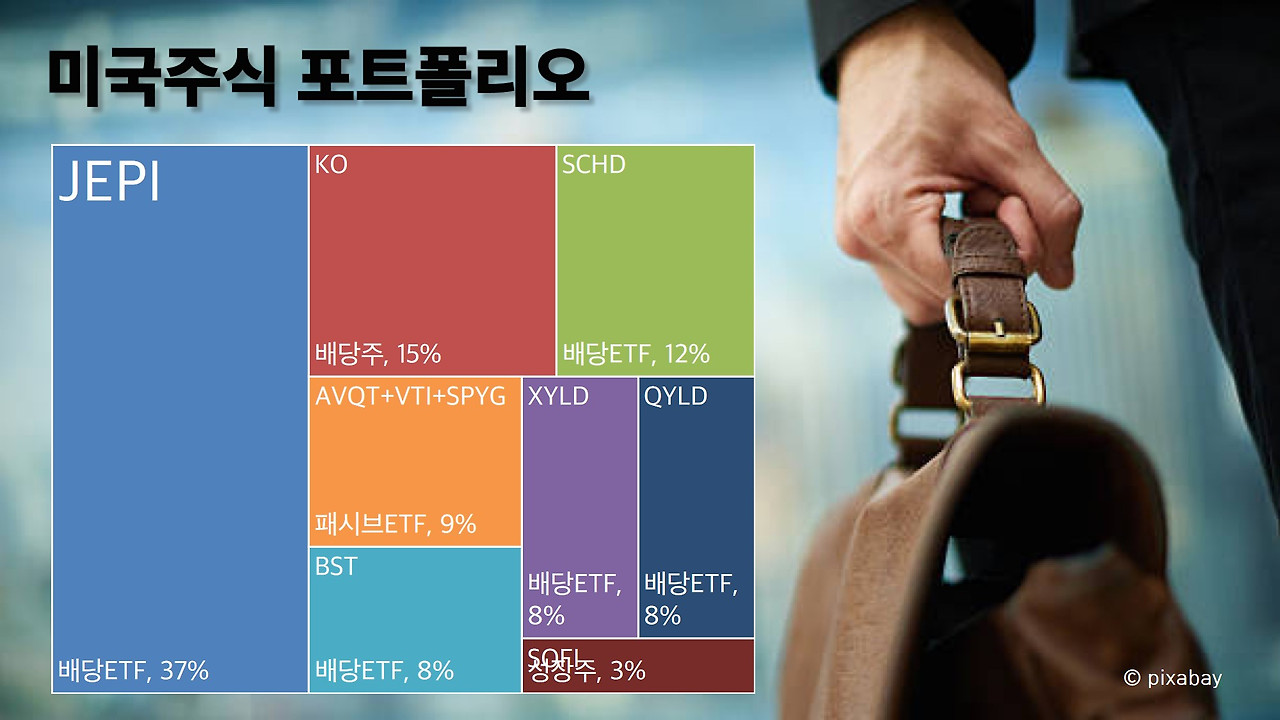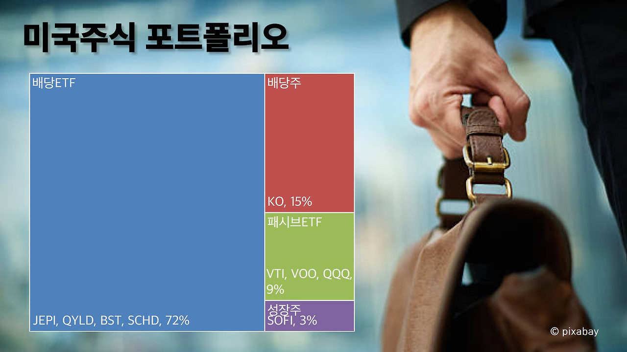 현재 종목별 포트 구성입니다. 10%가 넘는 고배당이자 월배당 ETF인 JEPI가 37%로 단일 종목 점유율 1위이며, 배당주 개별종목인 배당킹 코카콜라가 15%입니다. 올해 들어 공격적인 배당투자를 강화하기 위해 JEPI 보유수량을 300주 정도 늘려서 JEPI 구성비가 높아졌습니다. SCHD 12%, BST 8%, XYLD와 QYLD 각각 8% 구성비입니다. 미국 전체 기업에 투자하는 VTI 등 패시브ETF 구성비가 9%이고, 유일한 성장주 소파이가 3% 구성비입니다.