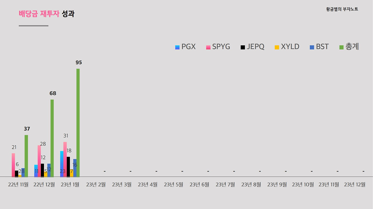 제가 적립해가는 5종목의 총 수량은 작년 11월에 37주에서 12월에 68주에 이어, 2023년 1월에는 95주까지 적립이 되었습니다. 이 적립수량은 계속 늘어갈 것이며, 해당 종목들의 새로운 배당금까지 더해져서 그 적립속도는 더 빨라질 것입니다. 배당투자는 이렇게 복리 효과를 누릴 수 있는 마법의 투자방식입니다.