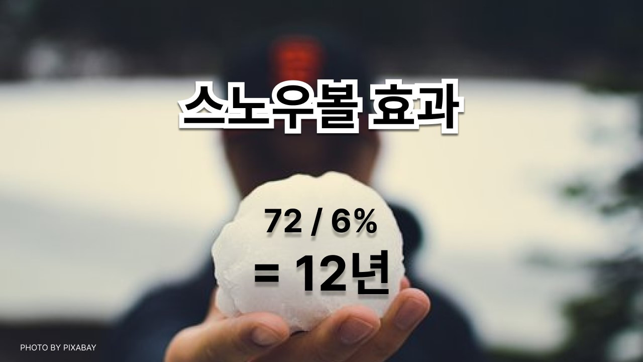워렌버핏은 “돈을 모으는 것은 눈덩이를 아래로 굴리는 것과 같으며, 그 언덕은 될 수 있으면 길수록 좋다. 나는 무려 60년 동안 아주 조심스럽게 눈을 굴려왔을 뿐이다.” 라고 말했습니다. 눈덩이를 만들어 굴리면 처음엔 커지는 속도가 느려 보이지만, 눈덩이가 커질수록 눈의 양(이자, 배당, 수익률)도 훨씬 많아진다는 논리로 장기적인 복리 투자를 설명한 스노우볼 효과(snowball effect)입니다.