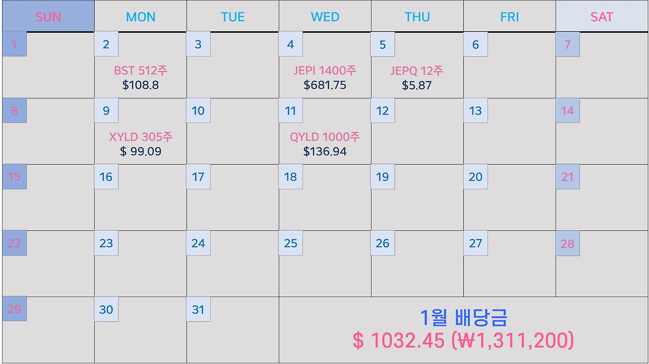 2023년을 시작하는 1월 첫 배당캘린더입니다. 2일에 BST 512주에서 108.8달러, 4일에 JEPI 1400주에서 681.75달러, 그리고 JEPI 배당금으로 재투자하고 있는 JEPQ가 어느덧 12주가 적립되어 5.87달러를 받았습니다. 예수금으로 지난 12월 마지막 주 하락장에 JEPI 300주를 추가해서 수량을 1400주까지 늘렸습니다.