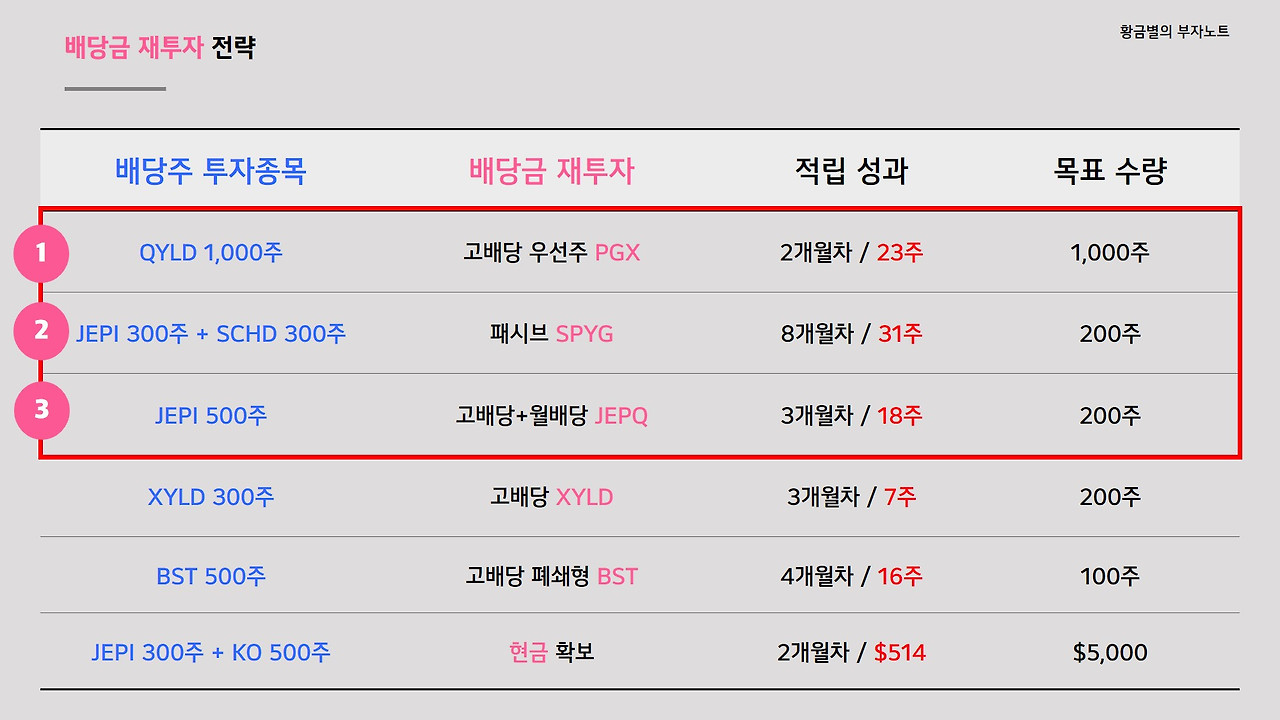1번 QYLD 1000주는 제가 지난 2년간 매월 받는 배당금으로 적립한 종목이고, 2번 JEPI 300주와 SCHD 300주, 그리고 3번 JEPI 500주는 미국주식 투자를 시작한 3년동안 얻은 투자수익입니다. 그래서 1번부터 3번까지 적립식 프로젝트는 제 투자원금이 아닌 투자소득, 자본을 투자해서 얻은 자본소득이기 때문에 시장이 급락하더라도 일희일비하지 않고, 제가 가고자 하는 방향대로 꾸준히 적립식 투자를 실천해서 목표를 이루고자 합니다. 이렇게 투자소득이나 배당소득으로 재투자를 실천해야 시장을 떠나지 않고 오래 머무를 수가 있습니다. 2023년에도 배당금 재투자 프로젝트별로 구체적인 적립 목표를 설정하고 월마다 성과를 점검해가는 과정을 공유드리겠습니다.
