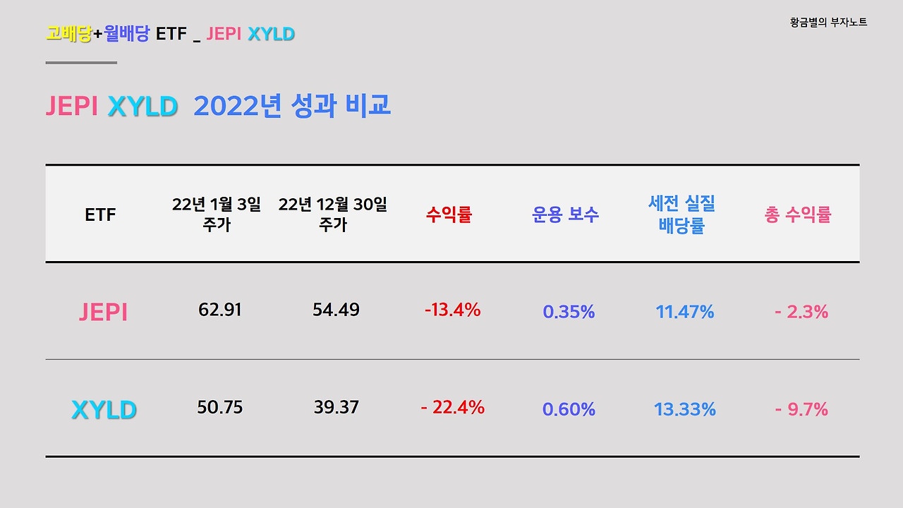 미국을 대표하는 S&P500지수를 따르면서 커버드콜-옵션이라는 운용 전략을 실행하는 고배당 ETF 라이벌 종목이 있습니다. 12%가 넘는 고배당 ETF이면서 매월 배당을 지급하는 월배당 ETF라는 공통점에 운용방식도 유사한 JEPI와 XYLD의 2022년 운용성과를 비교해 보겠습니다. 두 종목은 워낙 유명한 종목들이므로, 두 종목의 특징이나 운용 방식 등에 대한 분석은 향후 영상을 준비해보도록 하겠습니다. 오늘은 두 종목의 주가 수익률과 배당 수익률을 감안한 총 운용성과에 대해서만 비교해보겠습니다.