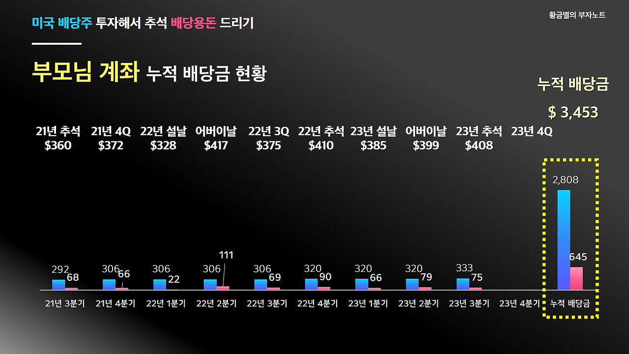 지금까지 2개 종목의 누적 배당금은 3,453달러로 환율에 따라 좀 차이는 있지만 분기마다 약 50만 원씩 450만 원 가량의 배당금을 용돈으로 드릴 수 있었습니다. 연간으로 환산해보면 세전 7.8%, 세후로는 6.7%가 넘는 배당률이기 때문에 은행 이자율 8% 정기예금에 투자해서 매분기마다 이자를 받고있는 효과입니다.