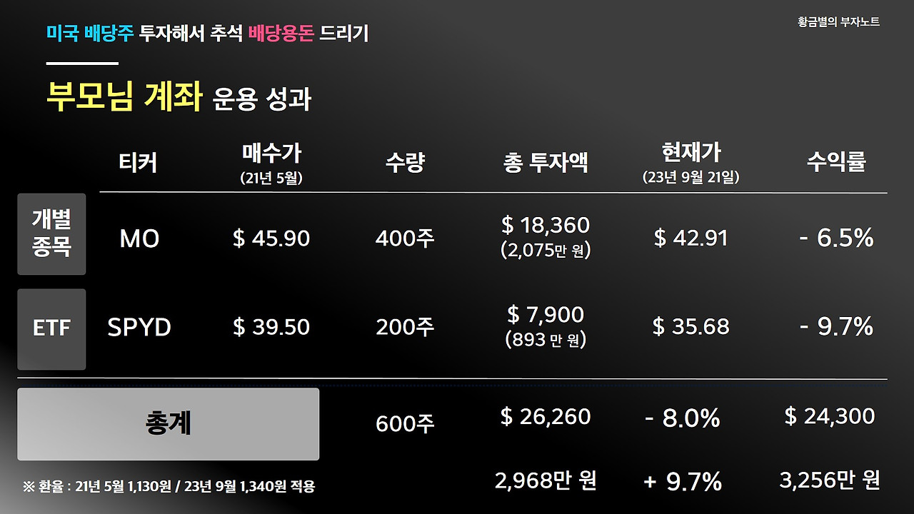 부모님 노후자금 3천만 원을 미국 배당황제주인 알트리아와 배당ETF인 SPYD에 투자해서 지금까지 얼마나 배당금을 받아서 용돈을 드렸는지 알아보겠습니다.