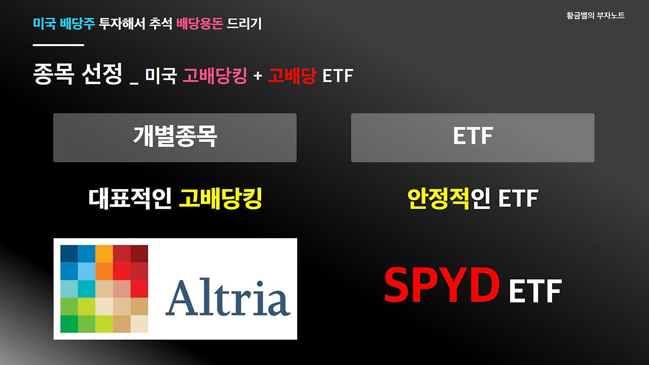 부모님 노후자금을 투자할 때 종목 선정이 중요하잖아요. 투자목적이 미래 시세차익보다는 매월 또는 분기 배당금을 통한 현금흐름이 목적이기 때문에 안정적인 전통가치주와 배당 ETF들 중에 적합한 종목을 선택했습니다. 투자원금 손실 가능성도 헷징하고 높은 배당률로 수익성을 극대화하기 위해 선택한 종목은 미국을 대표하는 고배당 배당킹 종목인 ‘알트리아‘ 와 고배당ETF인 4퍼센트대의 중배당에 안정적인 성향의 ‘SPYD ETF’였습니다.