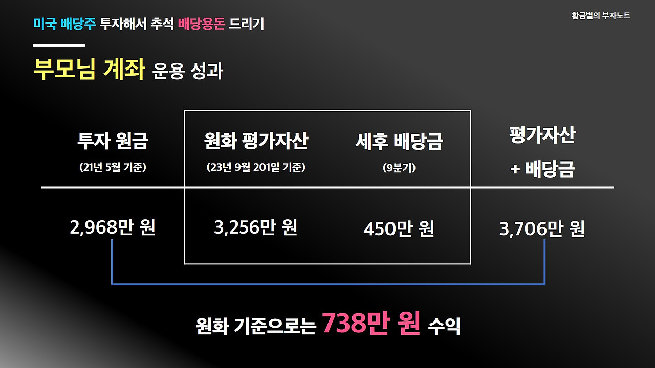 이 프로젝트를 처음 시도한 2021년 5월 당시 투자금은 2,968만 원이었고, 2023년 9월 현재 평가자산은 3,256만 원이며, 9분기동안 450만 원 정도의 배당금을 받아서 매분기마다 50만 원 정도의 배당용돈을 드릴 수 있었습니다. 평가자산에 그동안 드린 배당수익 450만 원을 더하면 총 수익은 738만 원 정도가 되겠네요.