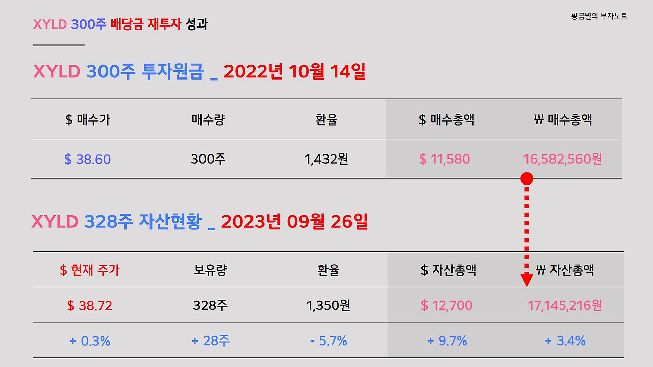 XYLD 300주를 매수한 시기는 2022년 10월 14일이었고, 매수가는 38.6달러였습니다. 하지만 당시엔 환율이 1,432원으로 엄청 높은 고환율 시기였어요. 그래서 XYLD 300주를 매수하는데 달러로는 11,580달러가 소요됐지만, 원화로는 1,658만 원이 투자가 되었습니다. 지난 1년 동안 XYLD 300주에서 받는 배당금으로 XYLD를 매월 2주 또는 3주씩 추가매수해서 현재 328주로 보유수량은 28주가 증가했습니다. 2023년 9월 기준으로 XYLD의 현재 주가는 39.15달러로 주가가 1.4% 상승했고 수량도 28주가 증가해서 달러자산으로는 12,841달러로 10.9% 증가했어요. 하지만 환율이 1,432원에서 1,340원으로 -6.4%나하락한 영향으로 원화 자산 총액은 1,720만 원으로 62만 원 증가한 상황입니다.