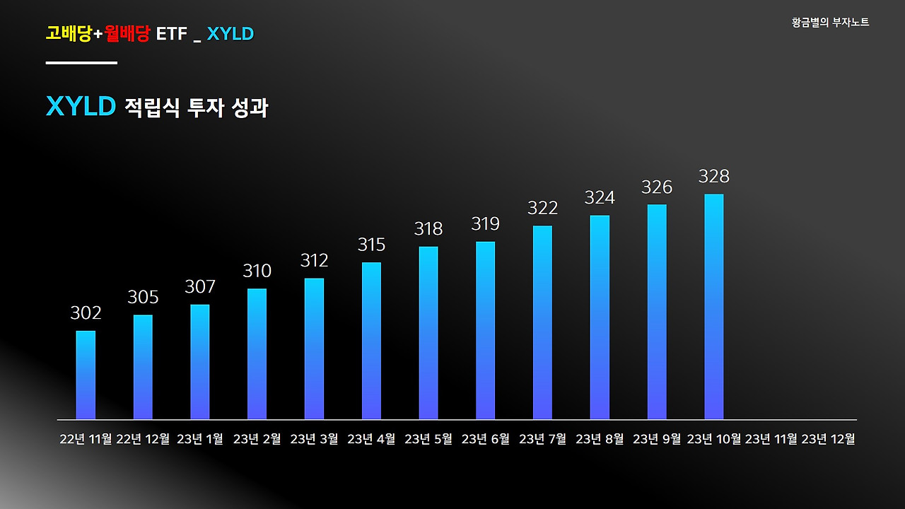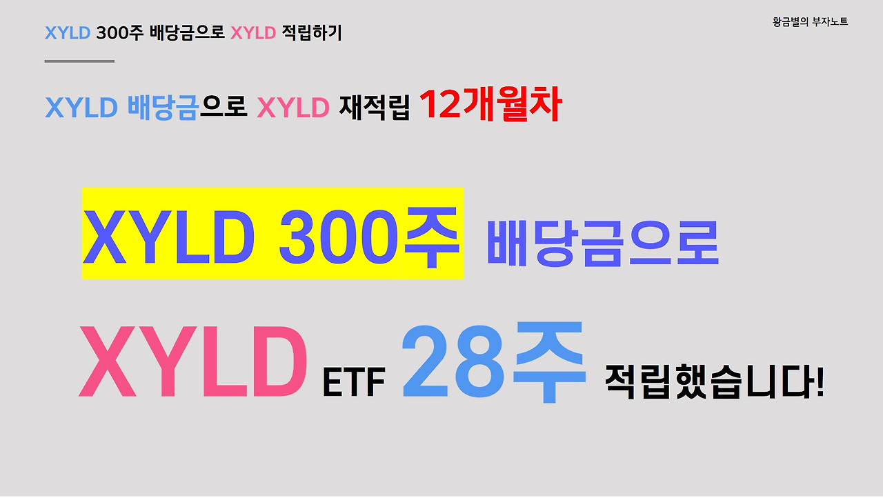 이런 적립식 프로젝트를 3년 이상 오랫동안 해보니까 시장의 변화에 일희일비하지 않고 악성댓글에도 상처받지 않고 꾸준하게 투자원칙을 지켜가며 도전해가는 과정이 좋은 성과로 이어지더라구요. 여러분들도 다른 사람의 말이나 뛰어난 성과에 휘둘리지 마시고, 본인이 세운 투자원칙과 기준을 가지고 목표를 달성할 때까지 도전해 가시기 바랍니다.고배당ETF인 XYLD 300주의 배당금으로 XYLD를 다시 재매수해가는 적립식 프로젝트 12개월차 운용 성과입니다. 12개월간 배당금을 재투자해서 XYLD ETF 28주가 추가 적립되어 328주가 되었습니다.