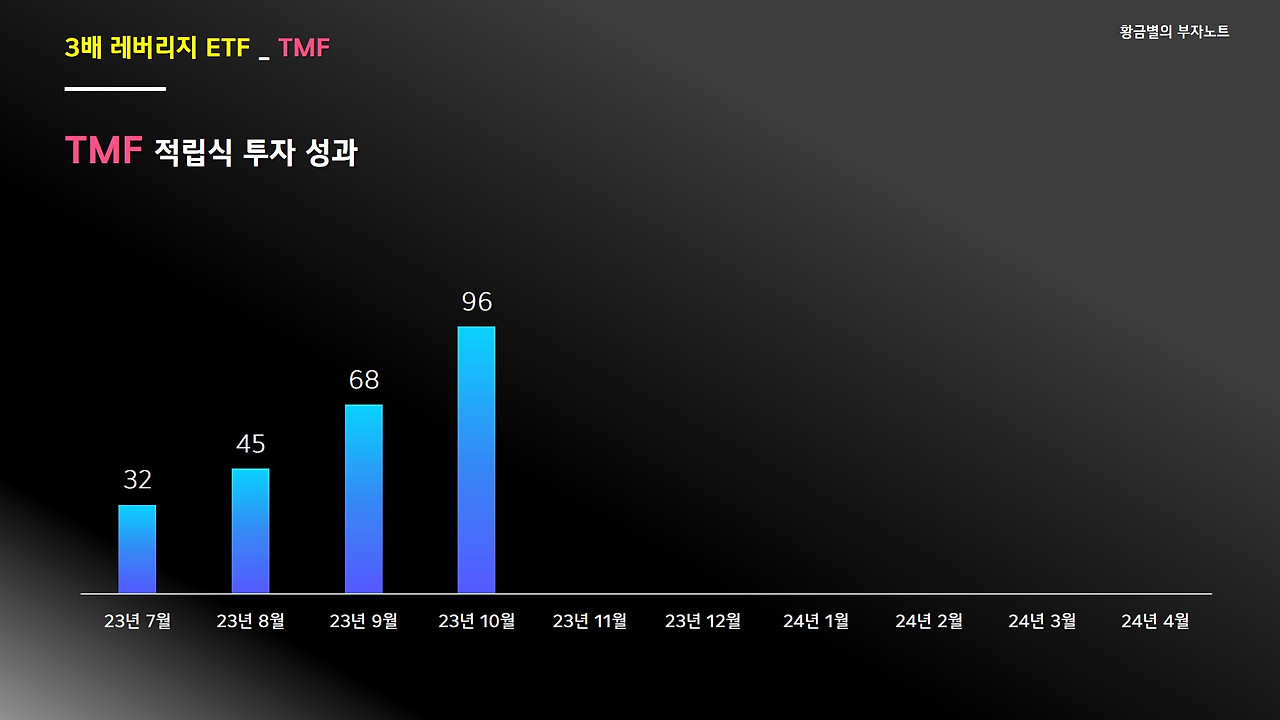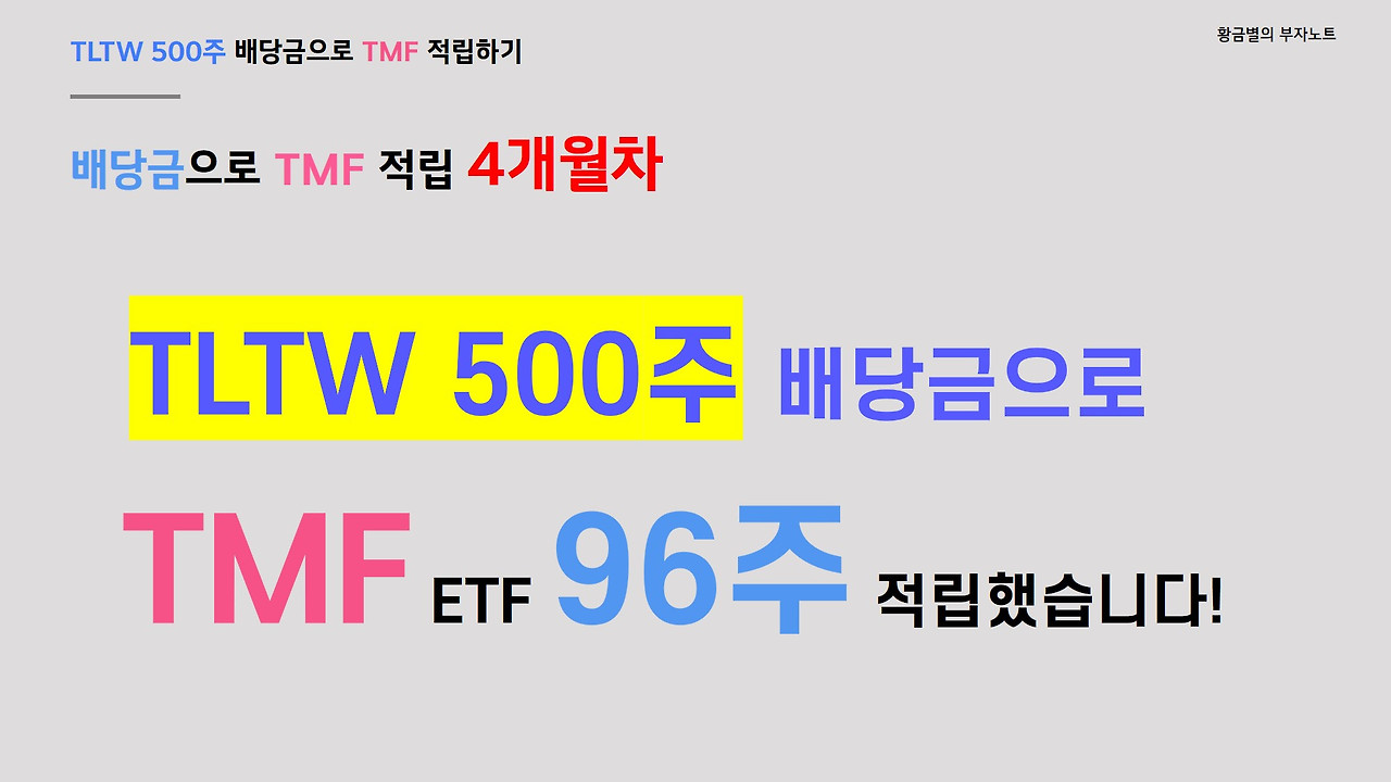 TLTW 500주에서 매월 받는 배당금으로 채권형 3배 레버리지ETF인 TMF를 매수하는 새로운 프로젝트 4개월차 적립 성과를 공유드리겠습니다.