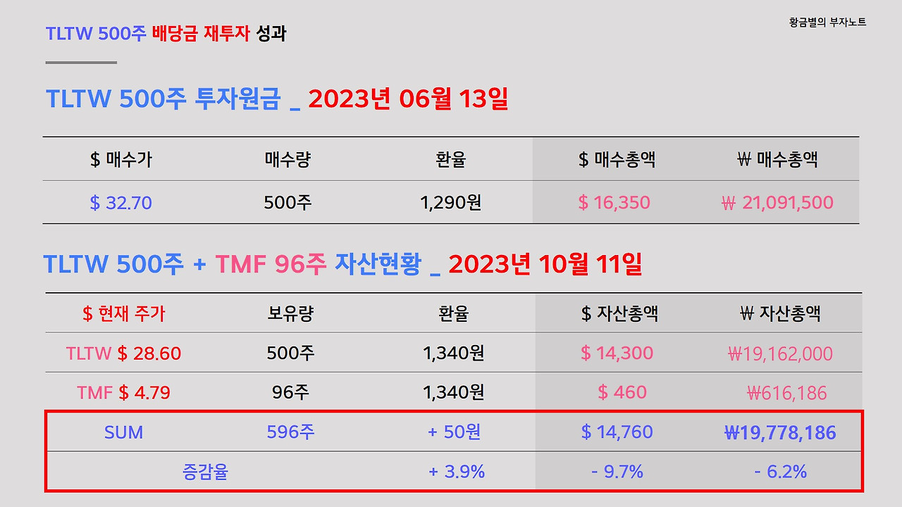 TMF 적립식 투자 성과입니다. 투자시점이 국채금리 급등에 채권 가격이 하락하는 좋지 않은 시점에 시작해서 주가는 폭락했고, 아직은 4개월 밖에 되지 않은 프로젝트이기 때문에 성과가 좋지는 못한대요. 지난 6월 13일에 TLTW 매수가는 32.7달러, 당시 환율은 1,290원이었습니다. 지난 4개월 동안 TLTW 500주에서 받는 배당금으로 TMF를 매월 꾸준히 적립해서 현재 96주까지 적립되었습니다. 2023년 10월 11일 현재 TLTW의 주가는 28달러 중반대까지 하락하며 주가가 12%나 빠졌습니다. 하지만 환율이 3.9% 상승했고 TMF 96주를 적립한 금액까지 더하면 달러로는 -10%, 원화로는 -6%, 약 130만 원 정도 손실이 발생한 상황입니다.