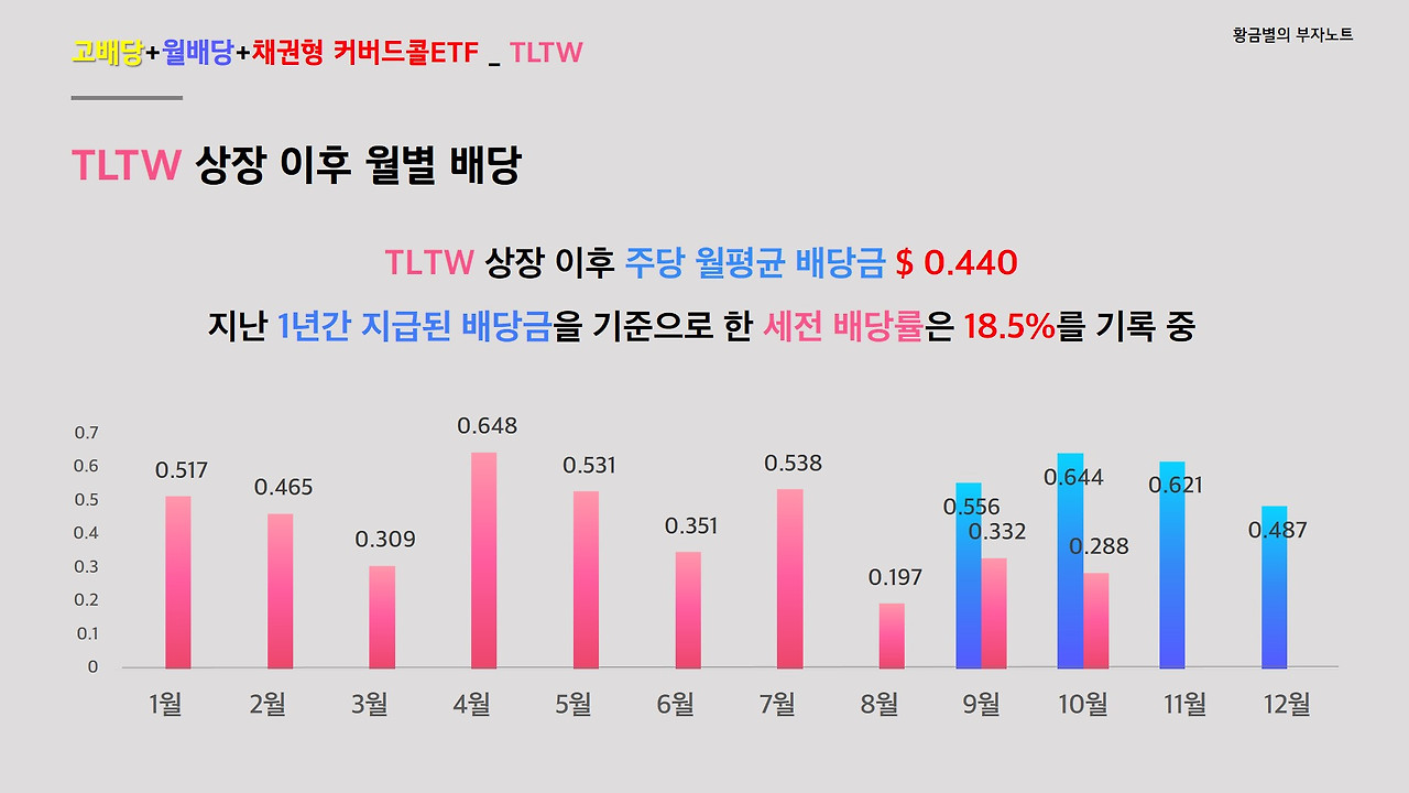 TLTW 500주 보유시 이번 10월에는 세후 122달러를 배당금으로 받았습니다. 7월에는 주당 배당금이 0.538달러라 500주 보유시 228달러를 받을 수 있었지만, 8월에는 주당 배당금이 0.197달러로 크게 감소되서 500주를 보유해도 83달러 밖에 받지 못했습니다. 월별 배당금 편차가 너무 심한대요. 아직 만 1년된 신생 ETF라 계속 지켜보면서 국채금리와 TLT 주가 변화에 따른 배당금 변화 추이를 살펴봐야할거 같습니다.