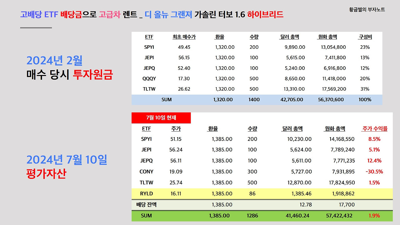 프로젝트 5개월차인 현재 평가자산을 계산해볼게요. 5개월치 차량 렌탈료 2490달러, 338만 원을 환전해서 납부했음에도, 현재 원화 기준으로는 평가자산이 5742만 원으로 1.9% 증가했는데요. 원달러 환율이 1385원으로 65원이나 상승한 영향이 가장 컸습니다. 달러 기준으로는 투자원금 대비 1200달러나 줄어들었어요. 종목별로 보면 SPYI와 JEPI, JEPQ는 매수 시점대비 5%에서 12% 주가가 상승했고, TLTW도 최근에 주가가 조금 회복되면서 원화로는 자산이 증가했는데, 초기 투자한 QQQY에서 CONY로 대체한 ETF들이 배당을 높게 주기 때문에 RYLD를 적립해가는데는 도움이 되지만 배당락이 워낙 커서 주가는 -30%나 빠졌습니다.
