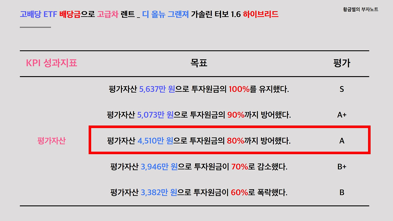 이 프로젝트의 KPI 성과지표입니다. 차량 렌트기간 5년 동안 매월 67만 원 렌트료를 납부하면서 투자원금 5,637만 원의 80%까지 방어할 수 있으면 A등급 합격점을 줄 것입니다. 그리고 투자원금 90%까지 방어할 수 있다면 A+ 등급을 부여하고, 만약 5년치 렌트료 4천만 원을 납부하고도 투자원금이 오롯이 100% 유지된다면 S 등급을 부여할 것입니다. 반면 프로젝트가 종료될 시점에 평가자산이 3,382만 원으로 투자원금의 60% 수준이 된다면 중고차 시세대비 큰 메리트는 없으므로 B등급 낙제점을 받을 것입니다.