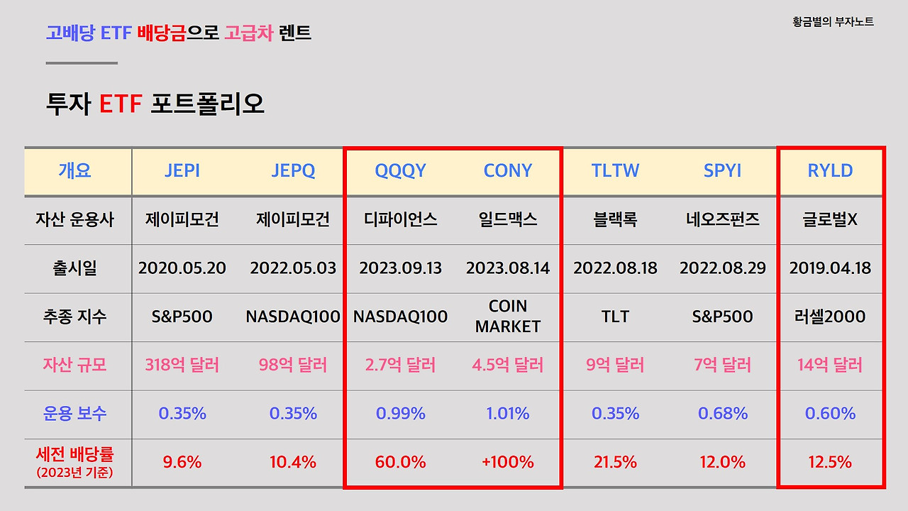 렌트료 납부하기 위해 선정한 고배당 ETF 종목은 5개입니다. 고배당 ETF들 중에 관리자산규모가 가장 큰 JEPI와 JEPQ 형제에 높은 배당금을 받기 위해 초고배당률 ETF인 QQQY를 선택했고, 채권형 ETF인 TLTW와 매월 고정된 안정적 배당금을 지급해주는 SPYI까지 총 5개 ETF를 선택했습니다.