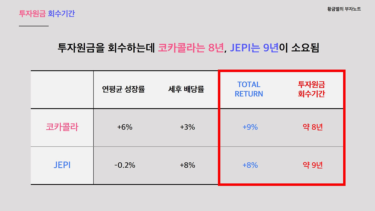 제가 배당주나 배당ETF와 고배당 커버드콜 ETF에 투자할 때 가장 중요하게 생각하는 건 투자원금을 회수하는 기간입니다. 대표적인 배당주인 코카콜라의 경우 지난 20년 간 연평균 주가 성장률은 약 6%이고, 세전 배당률은 3% 초중반이며, 세후 배당률은 3% 미만 입니다. 계산의 편의성을 위해 세후 3% 배당률이라고 가정하고 계산해보면, 주가 성장과 배당률을 더한 토털 리턴은 연평균 9%입니다. 그럼 코카콜라에 투자해서 원금을 회수하는데 까지는 약 8년 정도가 소요됩니다.