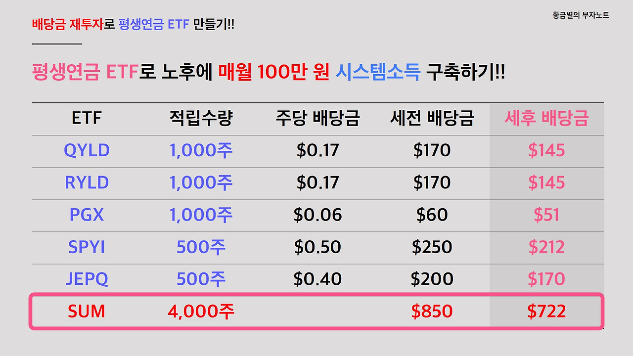 높은 배당을 주는 QYLD와 RYLD, PGX, JEPQ를 제외한 SPYG와 TMF는 각각의 프로젝트 목표가 달성되는데로 고배당 ETF로 전환할 것이고 이 모든 ETF를 평생연금계좌로 이체시켜서 황금별만의 평생연금ETF로부터 노후에 배당금을 연금처럼 받을 계획입니다. 앞으로도 계속 매월 받는 배당금을 재투자해서 목표로 한 수량을 적립하고 평생연금ETF 계좌에서 매월 100만 원이라는 배당소득, 시스템소득을 구축해 가고자 합니다.