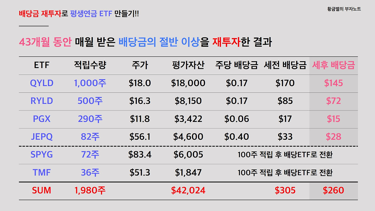 이렇게 한눈팔지 않고 43개월 동안 매월 받은 배당금을 습관처럼 재투자한 결과 QYLD 1000주와 RYLD 500주 PGX 290주, JEPQ 82주, SPYG 72주, TMF 36주 등 총 1980주가 배당금이라는 자본소득으로 적립이 되었습니다. 현재 주가를 기준으로 한 평가자산은 42,024달러로 약 5800만 원이며, 이 1980주에서 매월 지급되는 배당소득은 세후 260달러로 36만 원 정도가 되었습니다.