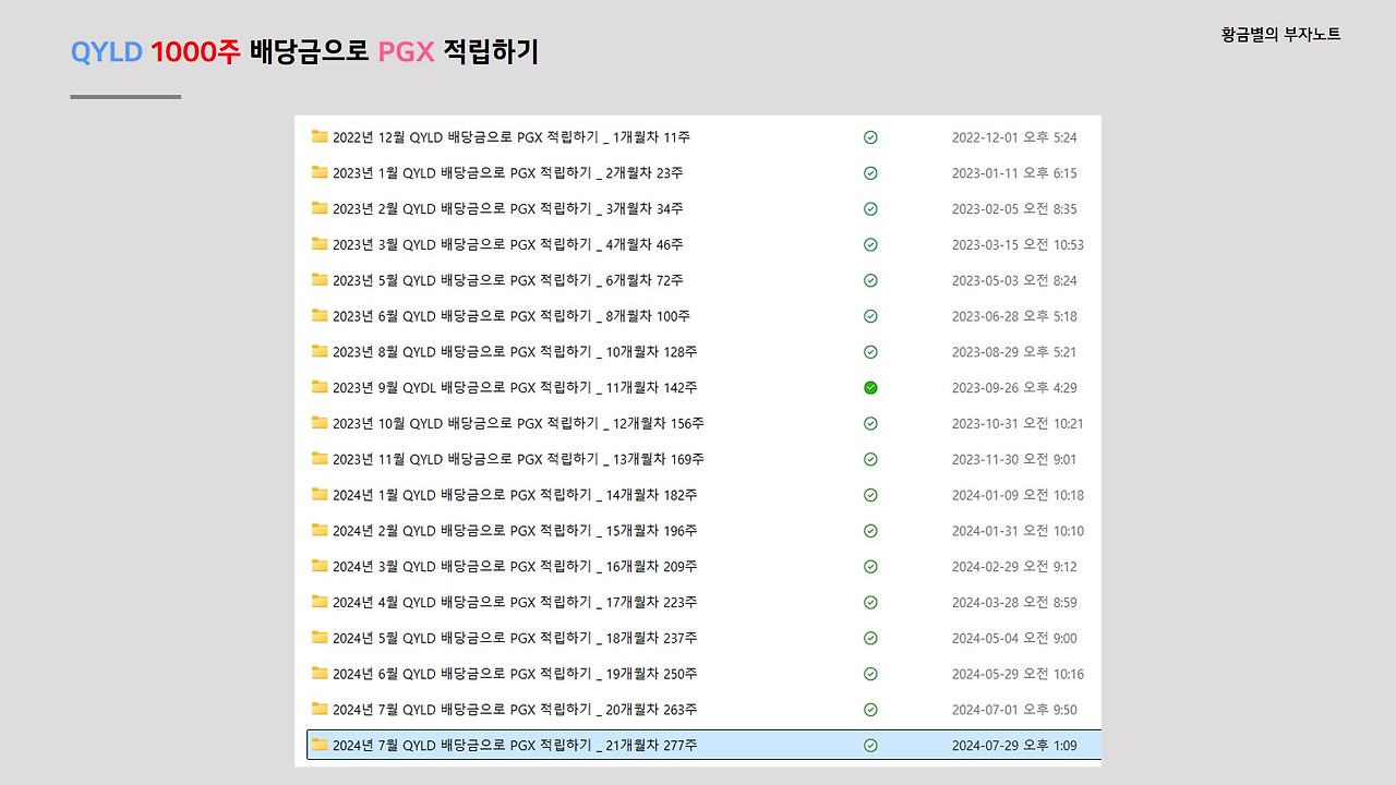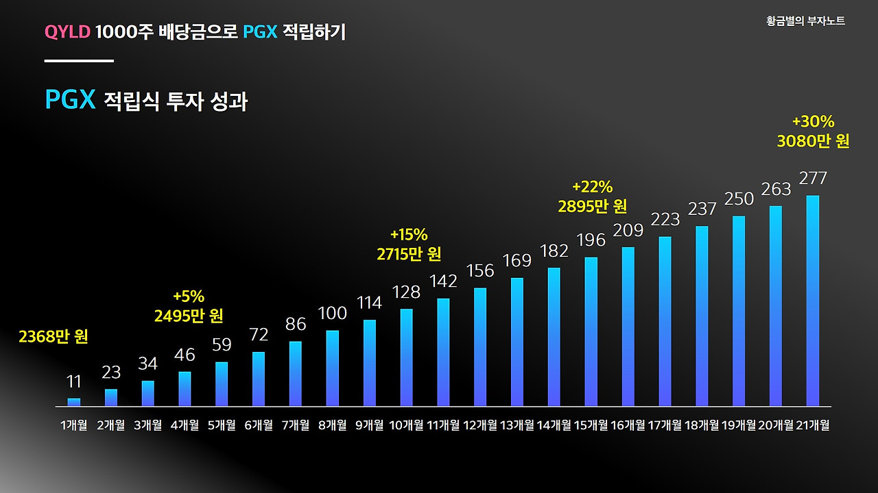 미국주식 배당투자 초기 2년동안 매월 받는 배당금으로 열심히 모은 QYLD 1000주로 또 다른 배당ETF인 PGX를 적립해가며 황금별만의 평생연금 ETF를 만들어가고 있습니다, QYLD도 원화기준으로 플러스 수익으로 전환되면서 21개월 동안 받은 배당금으로 PGX 277주가 적립되었습니다. 목표인 PGX 1000주를 적립할 때까지 시장의 폭락기가 찾아와서 QYLD 주가가 다시 15달러대로 하락하더라도 이 프로젝트를 중단하지 않고 끝까지 끌어갈 수 있다고 확신합니다. 그 이유는 QYLD 1000주는 제 투자원금이 아닌 배당금 즉 자본소득으로 적립했기 때문입니다. 나만의 평생연금 ETF를 만들기 원하시는 분들은 이렇게 배당금으로 배당ETF를 모아서 그 배당금으로 또 새로운 배당 ETF를 모아가는 신비로운 경험을 해보시면 좋겠습니다. 배당이 배당을 낳는 복리의 마법 효과를 직접 경험해보시기 바랍니다. 투자는 간접경험보다도 직접경험이 무척 중요합니다.