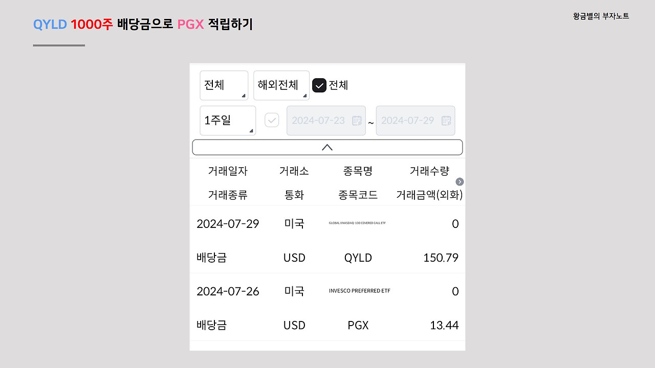 7월 26일에 PGX로부터 배당금을 받았고, 7월 29일 오후에 QYLD 1000주의 배당금이 지급되었습니다.