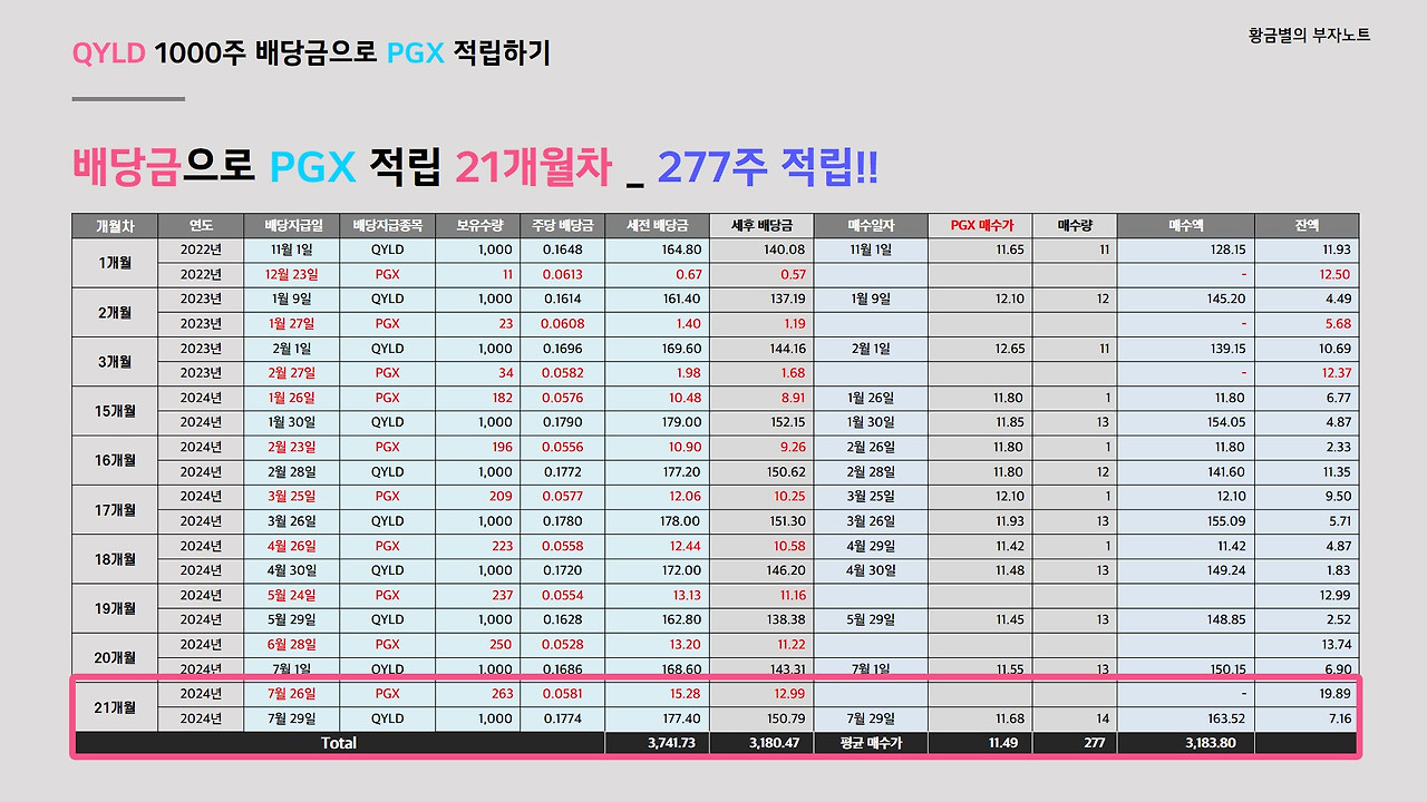 QYLD 월배당금으로 고배당 우선주ETF인 PGX 적립해 온지 21개월이 되었습니다. 1개월차에 11주를 적립했고, 2개월차에 12주, 3개월차에 11주 이번 21개월차에는 PGX 배당금 13달러와 QYLD 1000주 세후 배당금 150달러로 PGX ETF를 14주 추가 매수했습니다. QYLD 1000주의 배당금으로 PGX ETF를 재매수한지 21개월만에 277주가 적립되었고, PGX가 선물해주는 월배당금도 13달러가 되어 이제 PGX만의 배당금으로도 PGX 1주를 살 수 있는 배당금이 되었어요. 21개월 동안 받은 배당금 총액은 세후 3천달러가 넘었습니다.