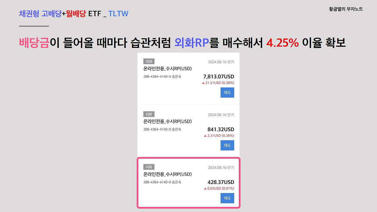 이렇게 TLTW에서 매월 배당금을 받으면 바로 외화RP를 매수합니다. 어제 TLTW의 세후 배당금 370달러와 TLT 배당금을 더해 바로 미래에셋계좌에서 4.25% 수시 외화RP를 매수했습니다. 매월 배당금이 들어오면 이렇게 외화RP에 투자해서 배당금에 매일 매일 달러 이자가 불어나도록 합니다. 이런 방식으로 배당금을 저축해가며 달러 보유액을 늘려 미래에 언제 닥칠지 모르는 위기에 대응해 놓습니다. 제 목표는 매월 매월 받는 소중한 배당금이라는 자본소득으로 투자원금을 회수하고, 일부는 재투자해서 평생연금ETF 계좌내에 현금흐름 시스템소득을 만들어가며 시장을 떠나지 않고 시장에서 오래 머무는 성공한 투자자가 되는 것입니다.
