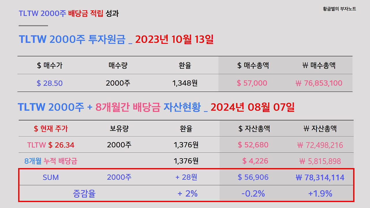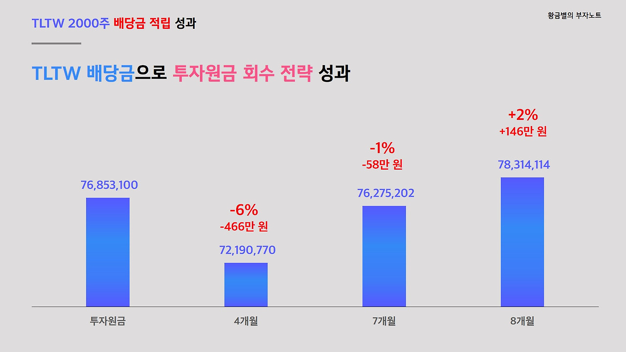 TLTW 2000주에 대한 투자원금은 7685만 원이었고, 4개월차였던 지난 4월에는 -6% 마이너스 수익률에 466만 원이나 손실이 컸었습니다. 당시 국채금리가 크게 상승해서 손실 폭이 컸는데요, 8개월차인 현재는 +2%로 플러스 수익률로 양전했고, 평가자산은 투자원금대비 146만 원 플러스 수익을 기록중입니다.