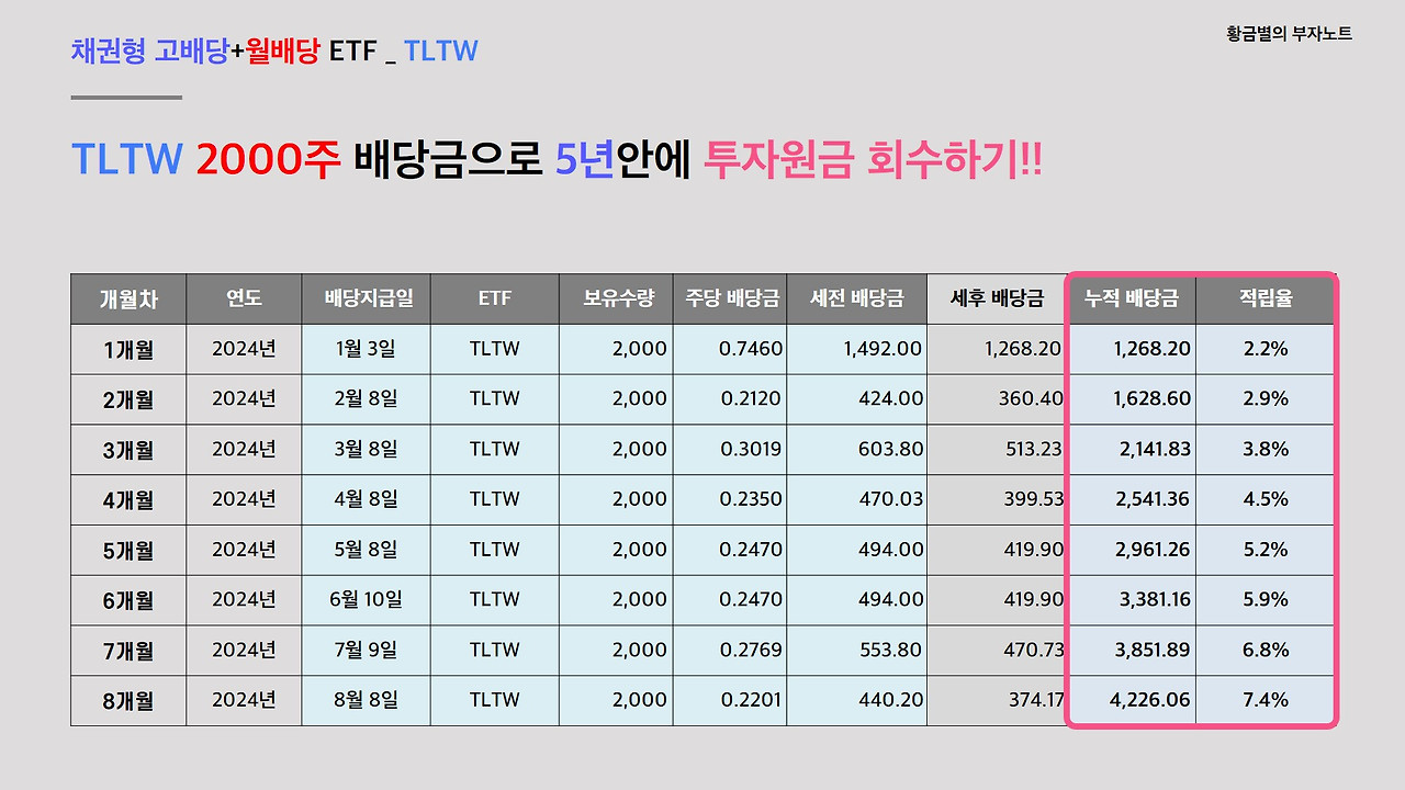 TLTW 4000주 중에 500주의 배당금으로는 매월 TMF를 적립해가고 있고, 500주는 배당금으로 차량렌트료를 납부하고 있습니다. 그리고 2000주는 배당금으로 달러외화RP를 매수해 투자원금을 회수하고자 합니다. TLTW 배당금을 달러로 적립한지 8개월차가 되었고, 투자원금의 7.4%가 적립되었습니다. 그리고 8개월만에 계좌의 평가자산이 플러스 수익으로 전환되었습니다.