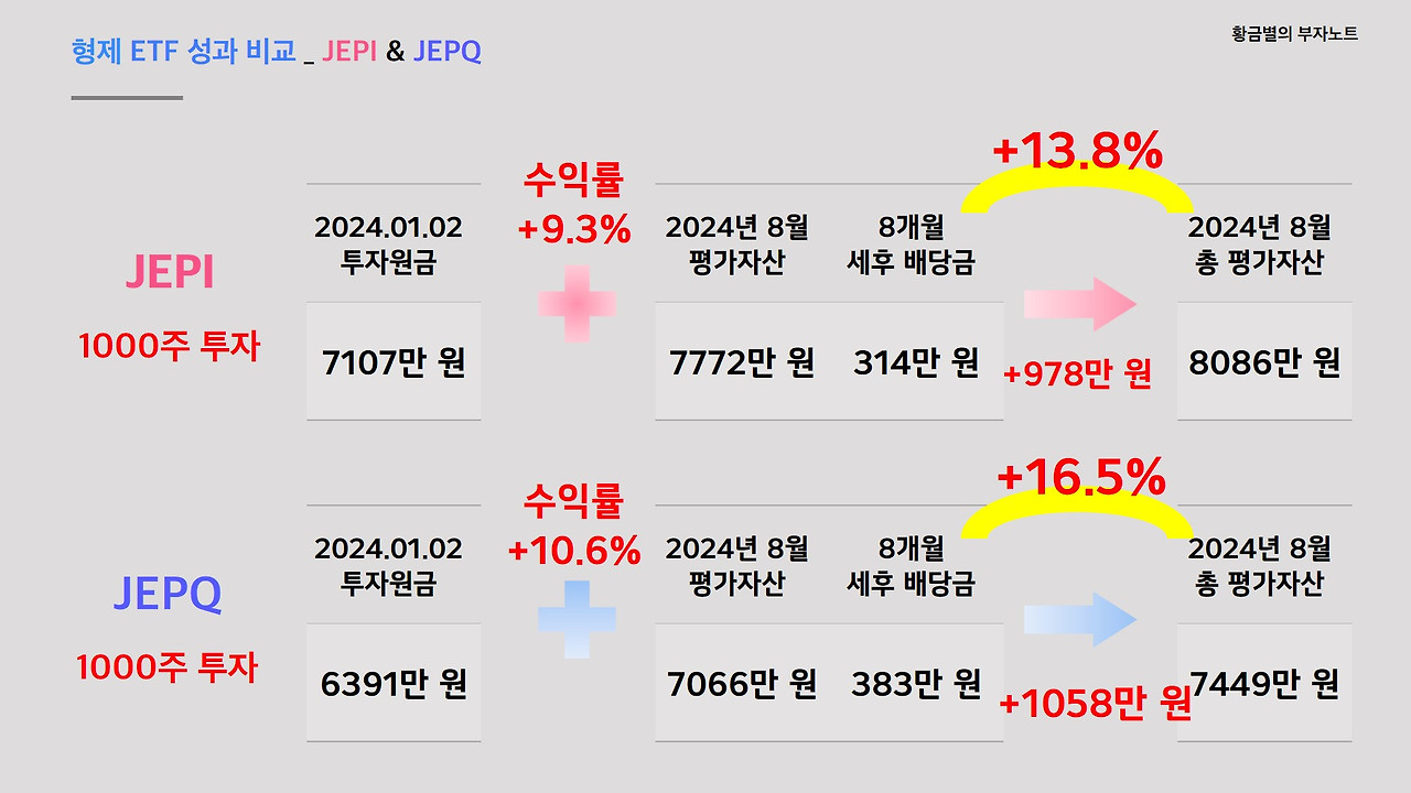 이번 영상에서는 최고의 배당 ETF 형제로 불리는 JEPI와 JEPQ의 올해 8월 현재 주가 수익률과 배당금을 더한 토털리턴 총 수익률을 비교해볼게요.