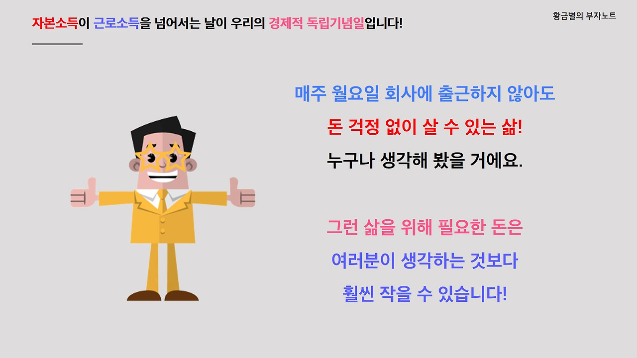 투자는 어렵죠. 부자가 되는 길은 평탄한 도로를 걸어가는게 아니라 산 넘고 물 건너 바다 건너 오랜 세월을 더위와 추위를 견디며 걸어야 하는 고행의 길입니다. 황금별의 부자노트 채널이 여러분과 어깨동무하며 먼 길을 함께 걸어가겠습니다!! 이 시대의 배당 투자자 모두 파이팅입니다!!