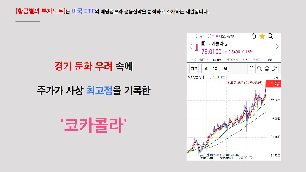 경기 침체 우려에 국제유가는 폭락해서 70달러까지 내려왔습니다. 안전자산에 대한 선호도가 커지면서 지난주 내내 하락했던 국채금리는 상승했습니다. 이 와중에 코카콜라는 역사상 최고의 주가를 기록했습니다. 코카콜라는 정말 위기에 강한 미국국채와 같은 안전자산 주식종목이네요. 그래서 경제위기를 대비해서 코카콜라나 알트리아 같은 배당황제주 종목을 담아두면 위기에 심리적 안정감을 얻을 수 있습니다. 최근 금리 인하 분위기가 고조되면서 리얼티인컴 같은 부동산 리츠주들의 주가도 다시 상승하고 있는 추세입니다.