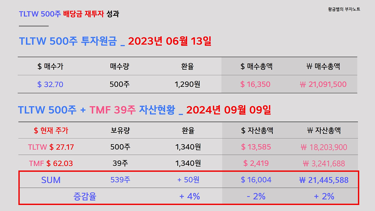 TMF 적립식 투자 성과입니다. 작년 6월 13일에 TLTW 매수가는 32.7달러, 당시 환율은 1,290원이었습니다. 지난 15개월 동안 TLTW 500주에서 받는 배당금으로 TMF를 매월 꾸준히 적립해서 현재 39주까지 적립되었습니다. 2024년 9월 9일 현재 TLTW의 주가는 27.17달러로 주가가 17%나 하락했습니다. 평가자산은 달러로는 -2% 손실로 아직까지는 마이너스지만 환차익까지 더해진 원화 평가자산은 2%가 증가한 35만 원 수익으로 투자한지 15개월만에 처음으로 마이너스 손실을 벗어나 플러스로 전환이 되었습니다. 이렇게 또 한번 소중한 투자 경험을 하게 되네요!