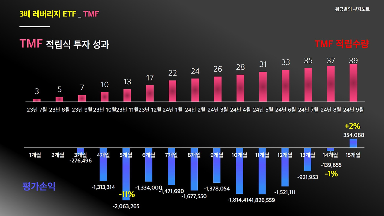 국채금리가 발작을 일으켰던 5개월차였던 작년 11월에는 마이너스 11% 수익률로, 손실액이 200만 원이 넘었습니다. 그 이후로도 계속 백 만원 이상대 손실을 기록해오다가 15개월차인 9월에 드디어 평가자산이 35만 원 증가했습니다. 프로젝트 시작한 이후로 단 한번도 플러스인 적이 없이 계속 마이너스 손실이 지속되고 있었는데, 계좌가 플러스로 양전했고, 금리 인하 이후에는 수익이 더 커질거란 희망이 생겼습니다. 금리 전환기 이후 투자원금을 회수하고 남은 TMF 수량은 매도 후에 평생연금 ETF계좌 내에 JEPQ같은 고배당ETF를 매수해서 현금흐름을 늘려갈 계획입니다.