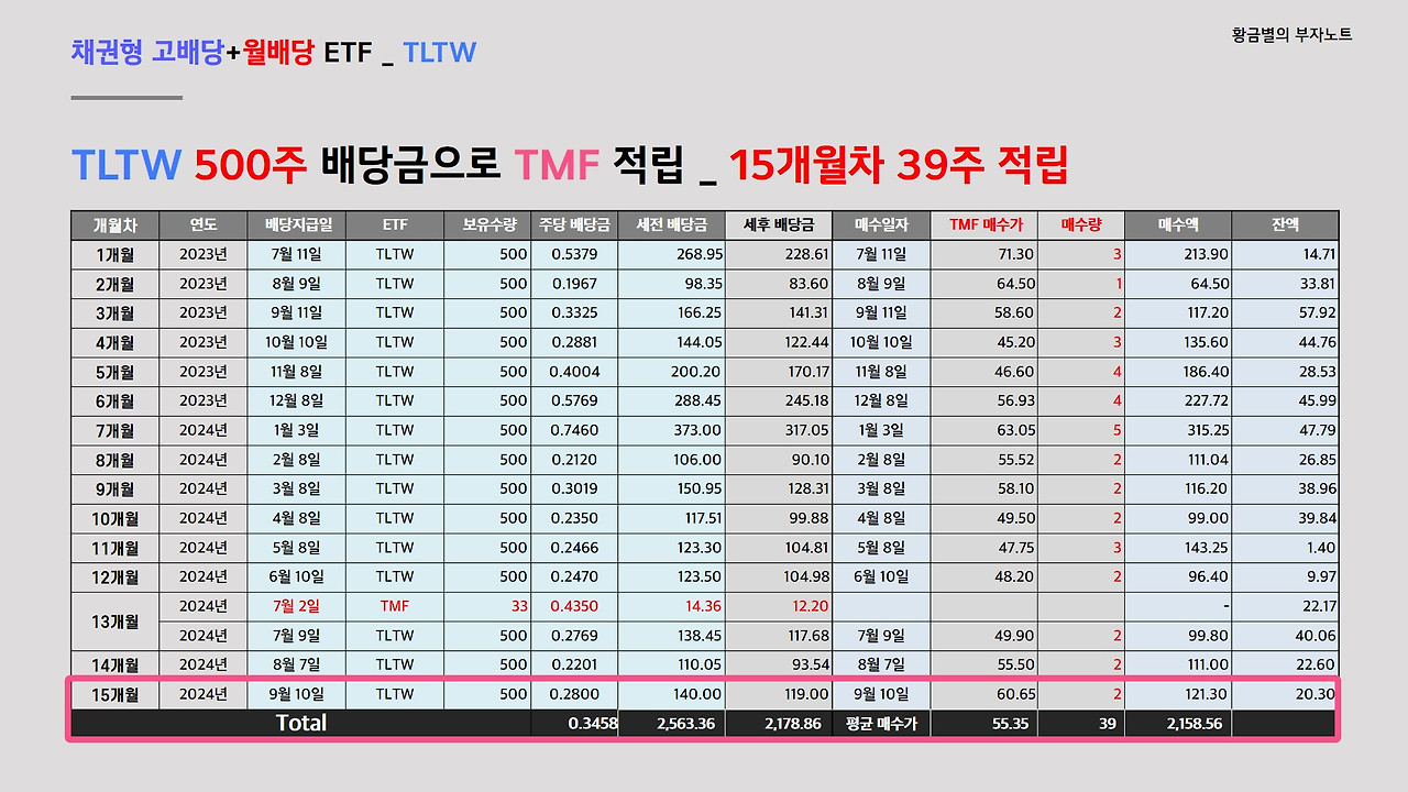 TLTW 500주에서 받은 배당금으로 채권형 3배 레버리지ETF인 TMF를 적립한 내역입니다. TMF는 작년 12월 1일부로 액면병합이 되서 5개월차인 11월까지 13주를 적립한 걸로 계산했습니다. 이번 9월에는 TLTW 500주에 대한 배당금으로 세후 119달러를 받아서 TMF를 60.65달러에 2주 추가 매수할 수 있었습니다. 어쨌든 이렇게 15개월동안 매월 받은 배당금으로 TMF 39주가 적립되었고, 적립기간 평균 매수가는 55.35달러입니다.