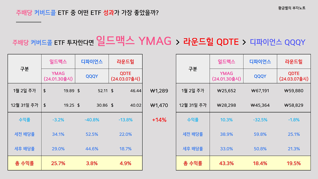 3개 ETF 중에서는 일드맥스의 YMAG 성과가 가장 뛰어났네요. QDTE와 QQQY는 성과 차이가 크지 않았습니다. 물론 작년 한 해 동안은 환율이 크게 급등했기 때문에 환차익까지 반영할 경우 YMAG는 43%의 수익을, QQQY는 18%, QDTE는 19.5%의 준수한 수익을 얻을 수 있었지만, 환율이 늘 오르란 법은 없으니 환차익이 ETF의 진정한 성과라기보다는 그냥 일시적인 보너스라고 간주해야 합니다.