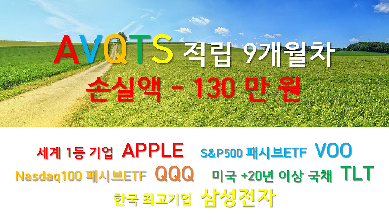 세계 1등 기업 애플, S&P500 지수를 추종하는 최강의 패시브 ETF인 VOO, 세계 최고의 기술주들이 모인 나스닥100을 추종하는 QQQ, 미국 20년 이상 국채에 투자해서 폭락장의 리스크를 헷징해주는 TLT, 그리고 한국을 대표하는 최고기업 삼성전자까지 5개 종목을 매월 1주씩 매수해가는 AVQTS 프로젝트가 9개월차에 접어들었습니다. AVQTS 9개월간의 운용 성과에 대해 공유드리겠습니다.