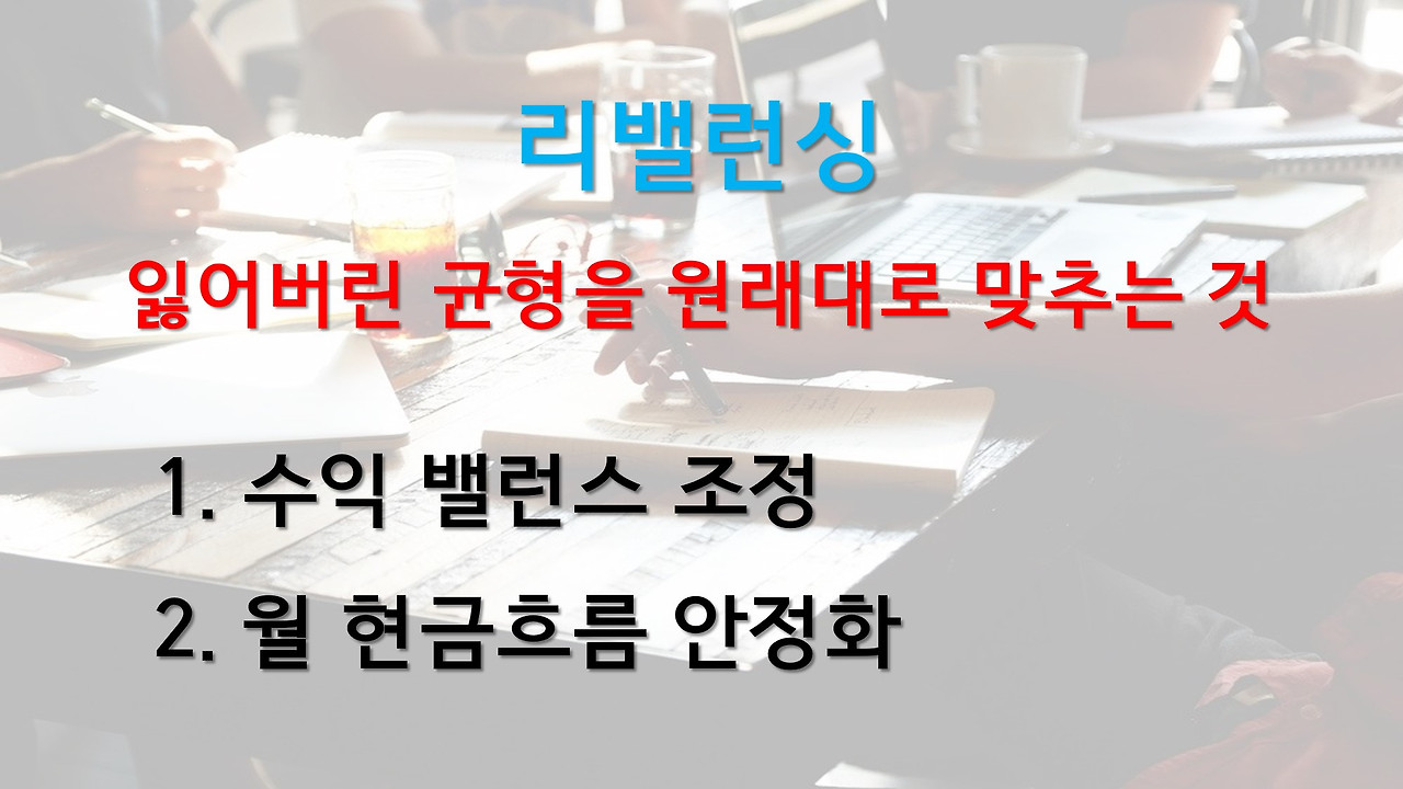 리밸런싱 Rebalancing이란 운용하는 자산의 편입 비중을 재조정하는 일로서 사전적 의미로는 자산균형재조정입니다. 주식 등 금융 자산에 대하여 일정한 기간을 주기로 투자처를 재조정하는 것으로 저는 주로 반기에 1번, 즉 1년에 2번 정도 리밸런싱을 하고 있습니다. 투자세계에 정답은 없듯이 투자방식 또한 정해진 건 없습니다. 리밸런싱 주기도 1년에 1번해도 되고, 반기나 분기 또는 매월해도 됩니다. 투자자 각자만의 운용방법으로 자신만의 투자철학을 기준으로 투자방식을 만들어가면 됩니다.
