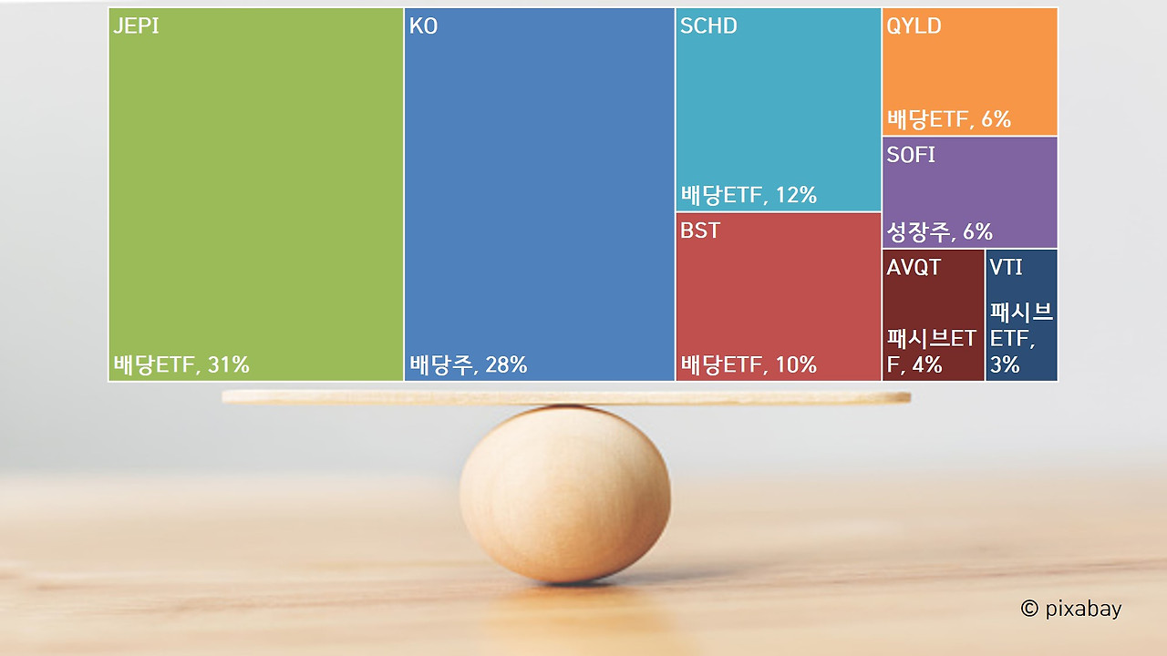 JEPI가 포트내 점유율 31%로 1위로 올라섰고, 코카콜라가 28% 점유율로 2위로 내려앉았습니다. 3위가 12% 점유비인 SCHD입니다. 위기에 방어력이 강한 코카콜라와 가장 안정적인 ETF들인 JEPI와 SCHD로 시장의 위기에 대응하는 방어적인 포트폴리오를 구축했습니다. 이번에 절반 가량을 매도한 BST는 10%로 점유비가 내려갔고, 매월 꾸준히 적립해가고 있는 QYLD가 6% 구성입니다.