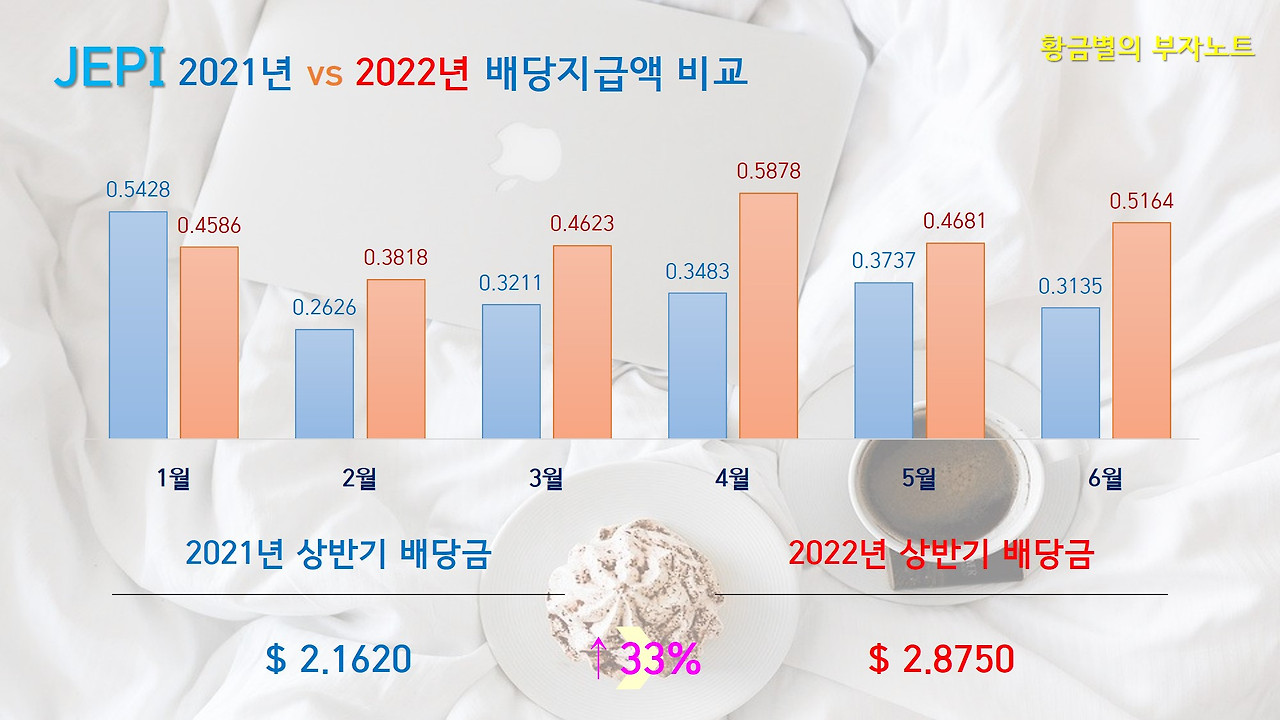 JEPI ETF 2021년 상반기 배당금과 2022년 상반기 배당금을 비교해볼게요. 파란색 막대그래프가 2021년 월별 주당 배당금이고, 주홍색 막대그래프가 2022년 월별 주당 배당금입니다.