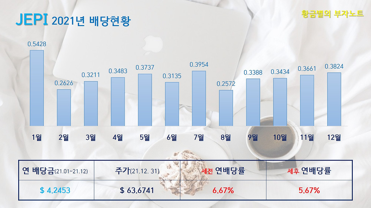 JEPI ETF 2021년 배당현황을 살펴볼게요. JEPI는 월배당ETF라 매월 배당금을 지급합니다. 작년 한 해 동안 주당 4.2453달러를 배당으로 지급해서 작년 종가 63.6741달러 대비해서 세전 6.67%의 배당률을 기록했고, 세후로 계산해도 5.67%의 배당률을 기록했습니다.