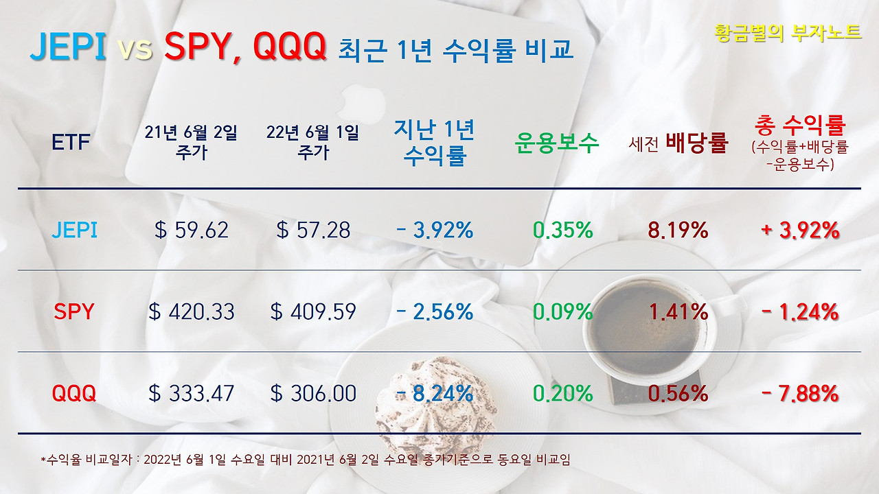 JEPI ETF의 최근 1년 수익률을 미국을 대표하는 패시브 ETF인 SPY, QQQ와 비교해보겠습니다. 6월 1일 수요일 마감 기준으로 전년 동요일인 6월 2일 수요일 종가와 비교해보면, 지난 1년 수익률이 마이너스 -3.92%이고, 세전 배당률 8.19%를 더하고 운용보수 0.35%를 빼면 총 수익률은 +3.92%입니다.