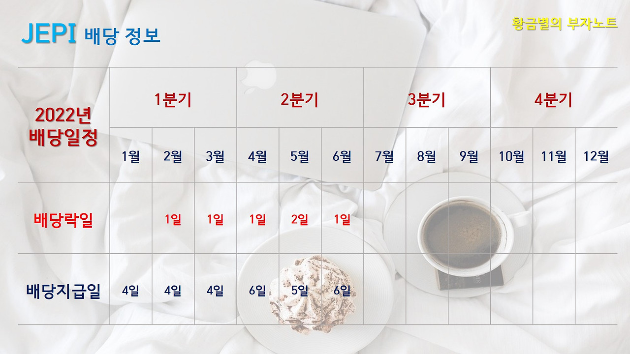 JEPI 배당락일은 매월 1일인데, 1일이 공휴일이면 휴일 다음 영업일이 배당락일이 됩니다. 매월 4일에서 7일 사이에 배당금을 지급합니다. 이번 6월에도 1일이 배당락일이었고, 미국은 6일 월요일에 배당금이 지급되지만, 한국은 법정 공휴일로 예탁원 및 증권사가 쉬기 때문에 7일 목요일에 지급받을 수 있을 것 같습니다.