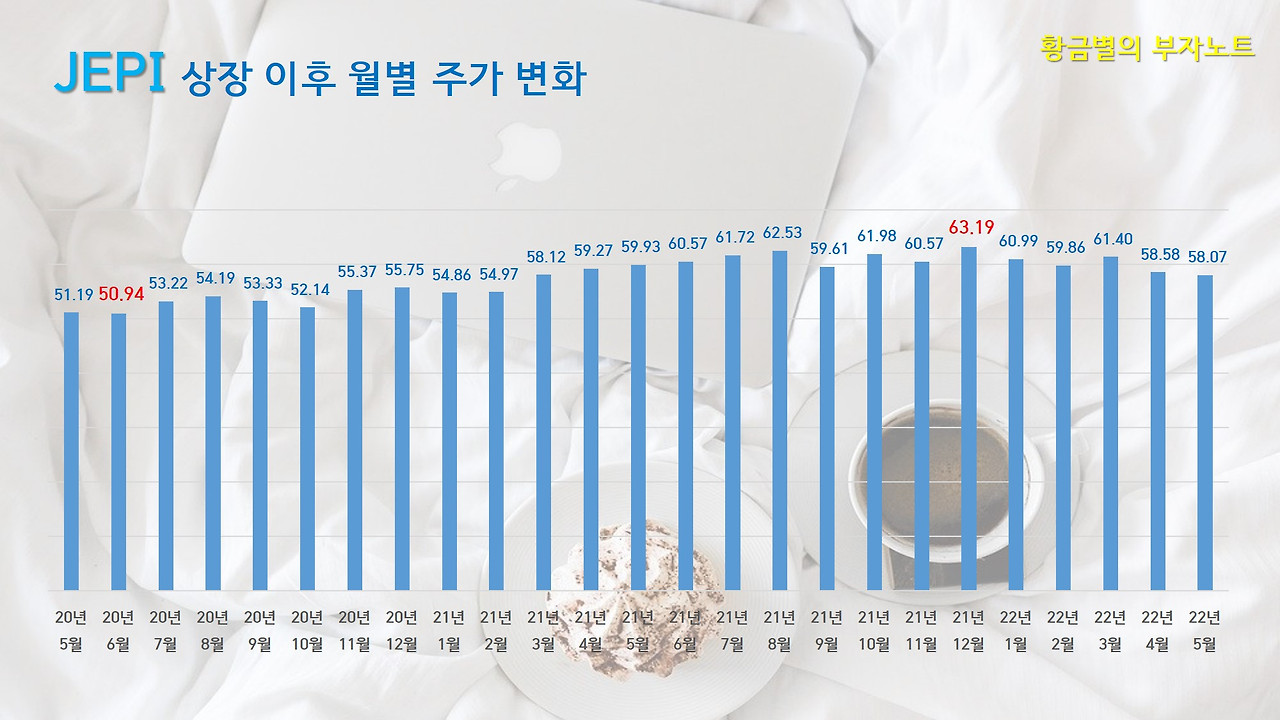 JEPI의 상장 이후 월별 주가현황을 보시면, 일자 기준이 아닌 월말 종가기준으로 최저점은 20년 6월의 50.94달러, 최고점은 21년 12월의 63.19달러입니다.